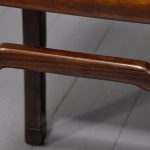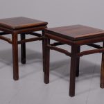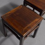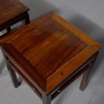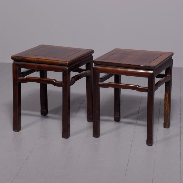 Circa 1880. Matched pair of Chinese Qing dynasty hongmu stands, the square tops with inset floating panels supported on square-section legs joined by humpbacked stretchers. In excellent condition with lovely rich colour and patina.