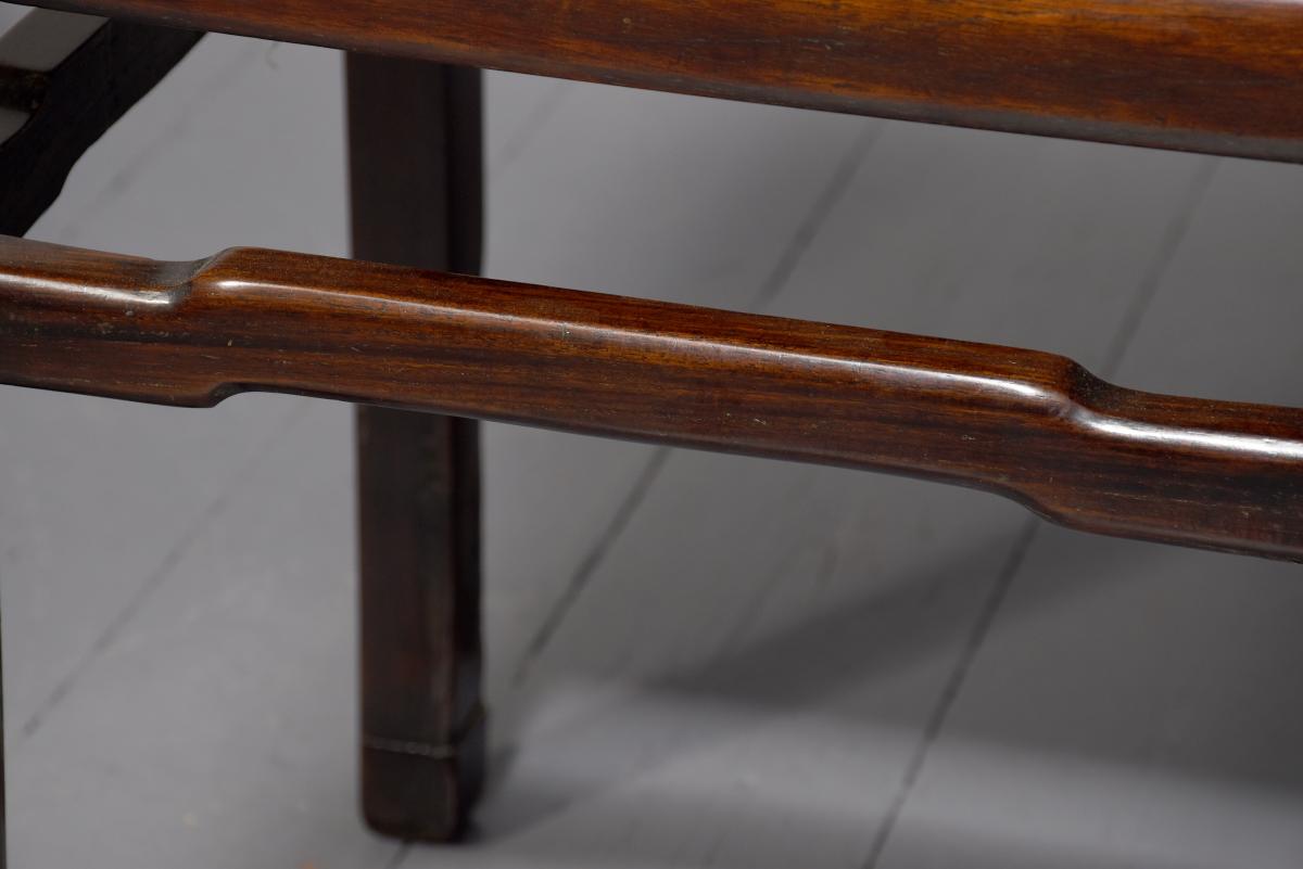 Circa 1880. Matched pair of Chinese Qing dynasty hongmu stands, the square tops with inset floating panels supported on square-section legs joined by humpbacked stretchers. In excellent condition with lovely rich colour and patina.