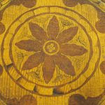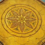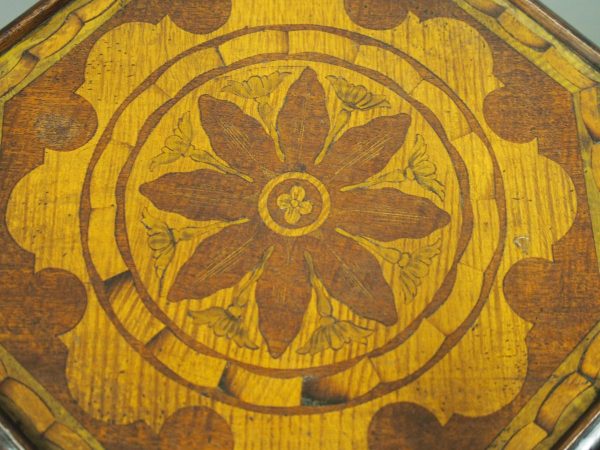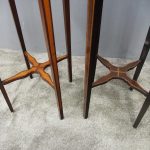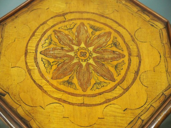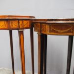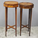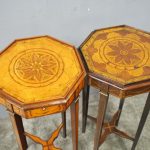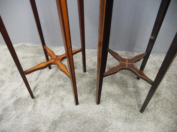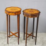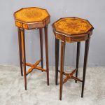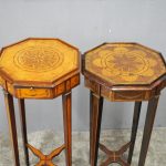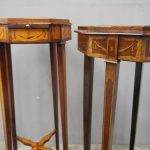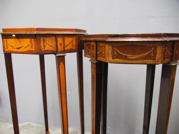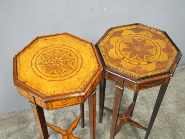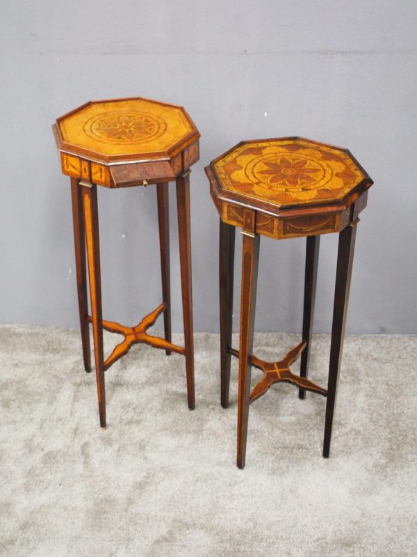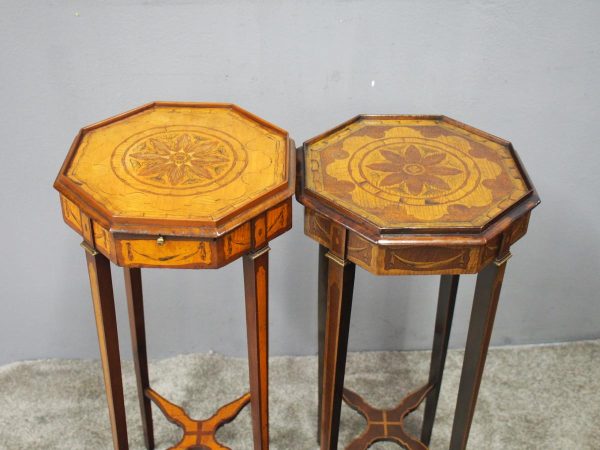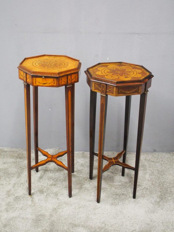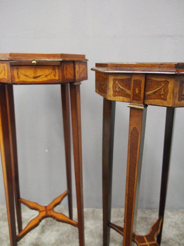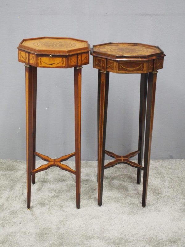 Circa 1890, matched pair of George III style inlaid urn stands. In an octagonal shape with a slightly raised gallery and profusely inlaid centres, above a small pull out slide finished with a small cast brass knob. The legs are topped with a brass collar, and the apron is profusely inlaid, standing on square, tapering legs with inlaid panels to the facings. Towards the base is a cruciform inlaid stretcher, for extra stability.