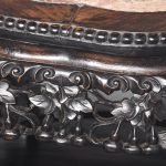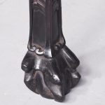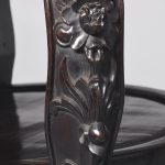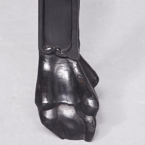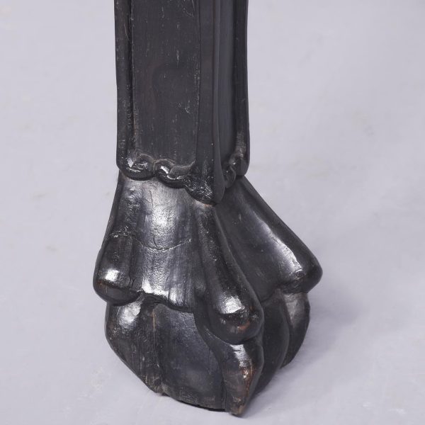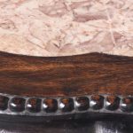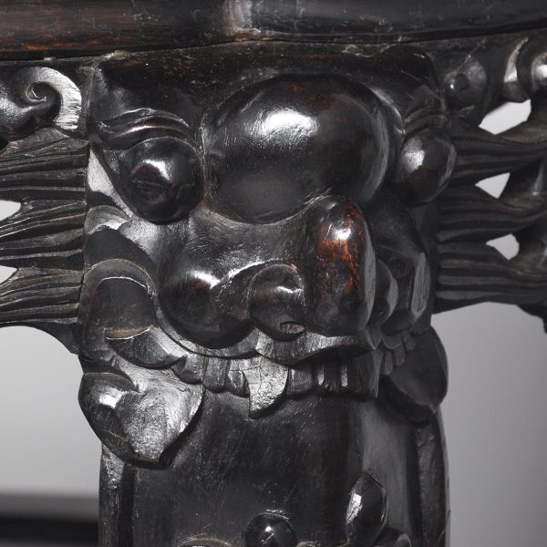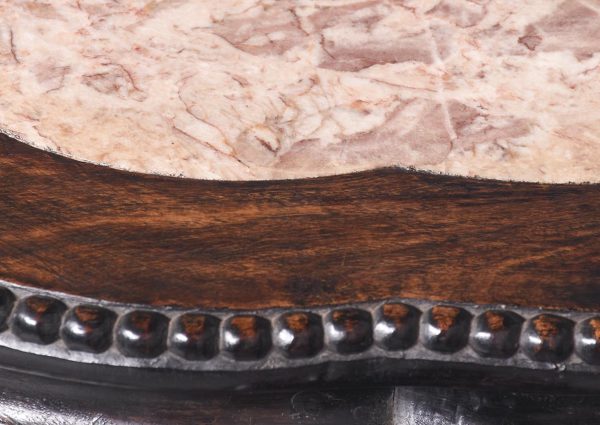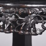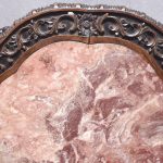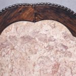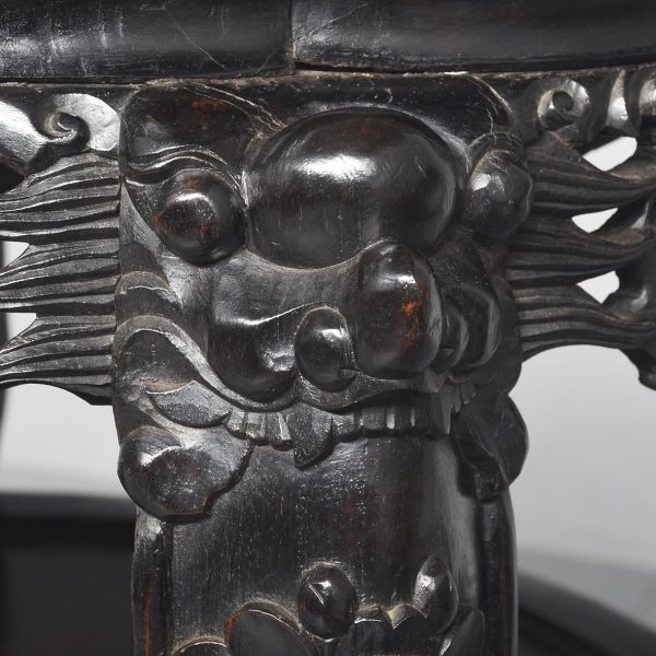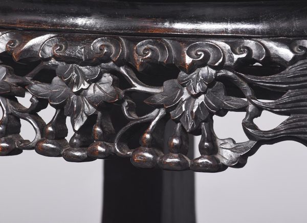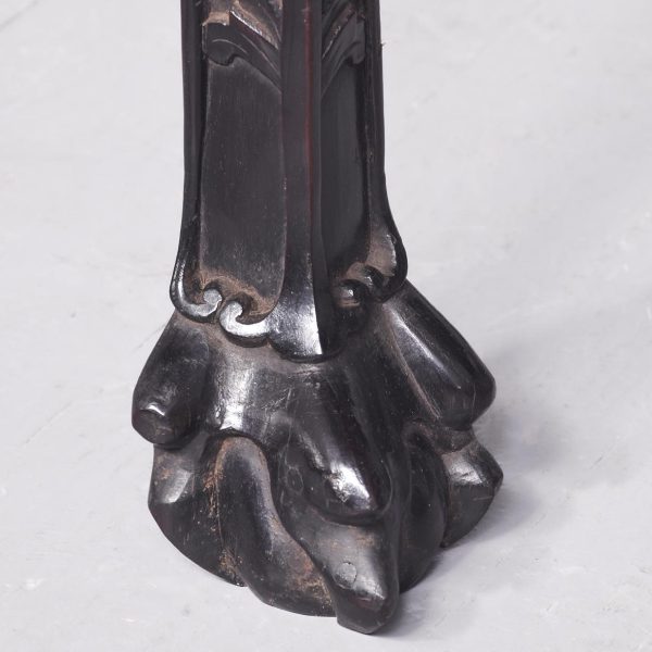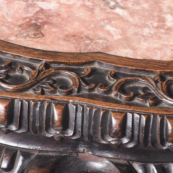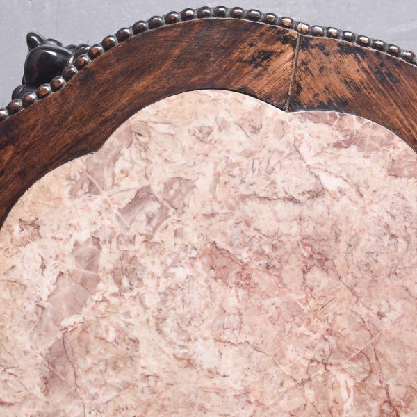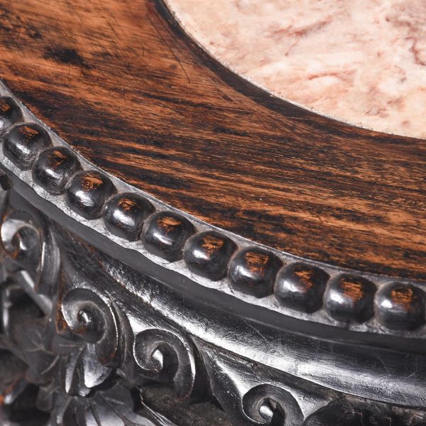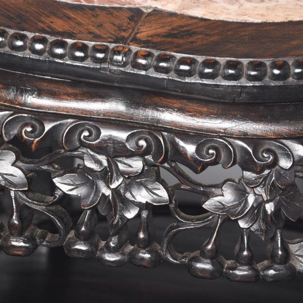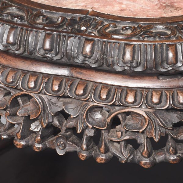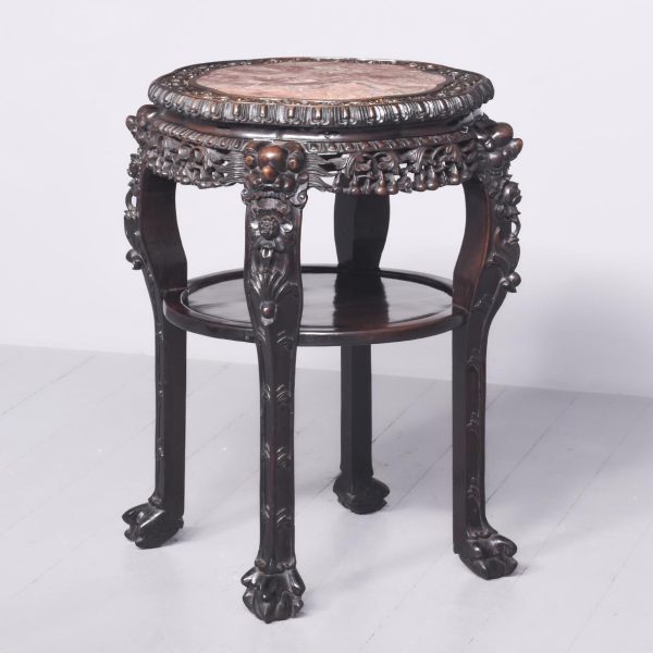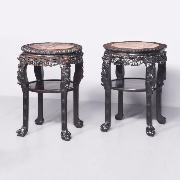 Circa 1890. A matched pair of Qing Dynasty Hongmu carved Chinese marble topped plant stands. The pair can be split. The similar stands with petal shaped tops in pink variegated marble, one with a carved frieze and the other with a beaded fore edge each with typical Chinese pierced and shaped friezes with classic Chinese motifs. Each with an undershelf resting on four similar legs with mythical dragons on the front and foliate carvings and beadings beneath, resting on a primitive animal foot.