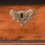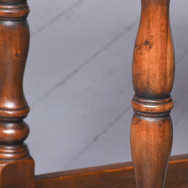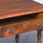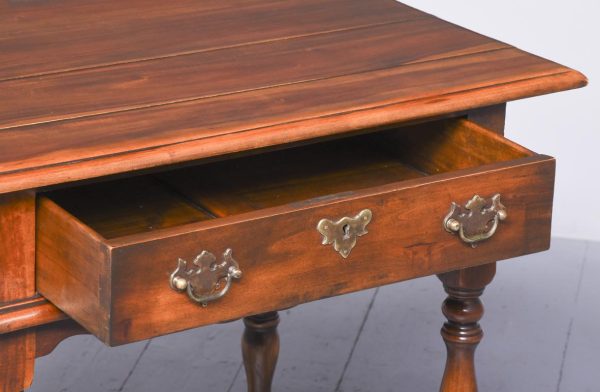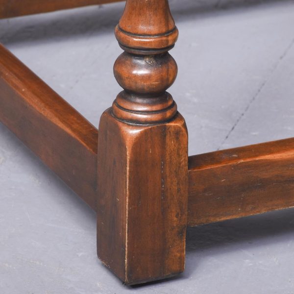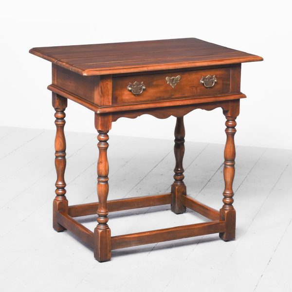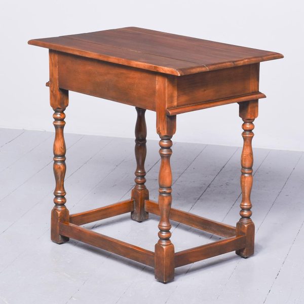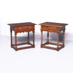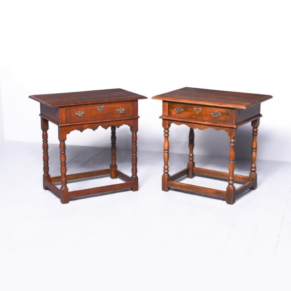 Circa 1990s. Pair of Charles II style side tables in walnut, solid rustic tops with stressed moulded edges, a full-length drawer with cast brass escutcheon, swan neck handles, with beading beneath the drawer and a shaped frieze, one of the tables stands on turned tapering legs, the other on bobbin style legs. All are intersected by the conforming stretchers. The tables are clean and stylish and each comes with a working lock.