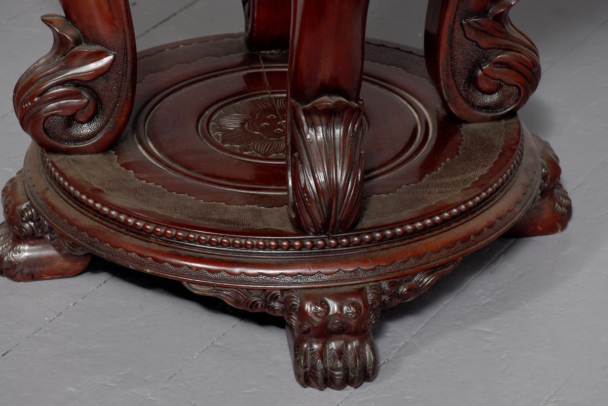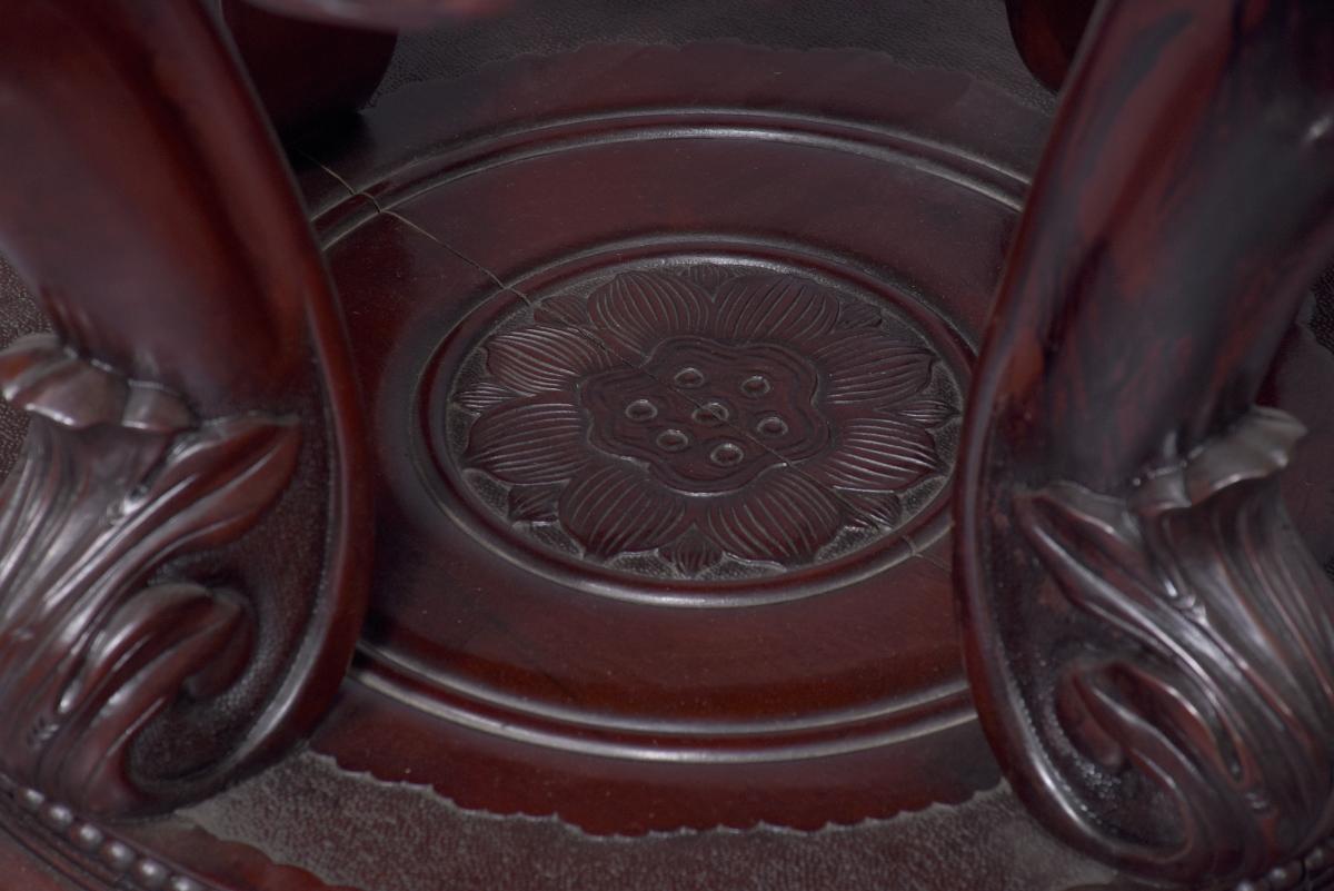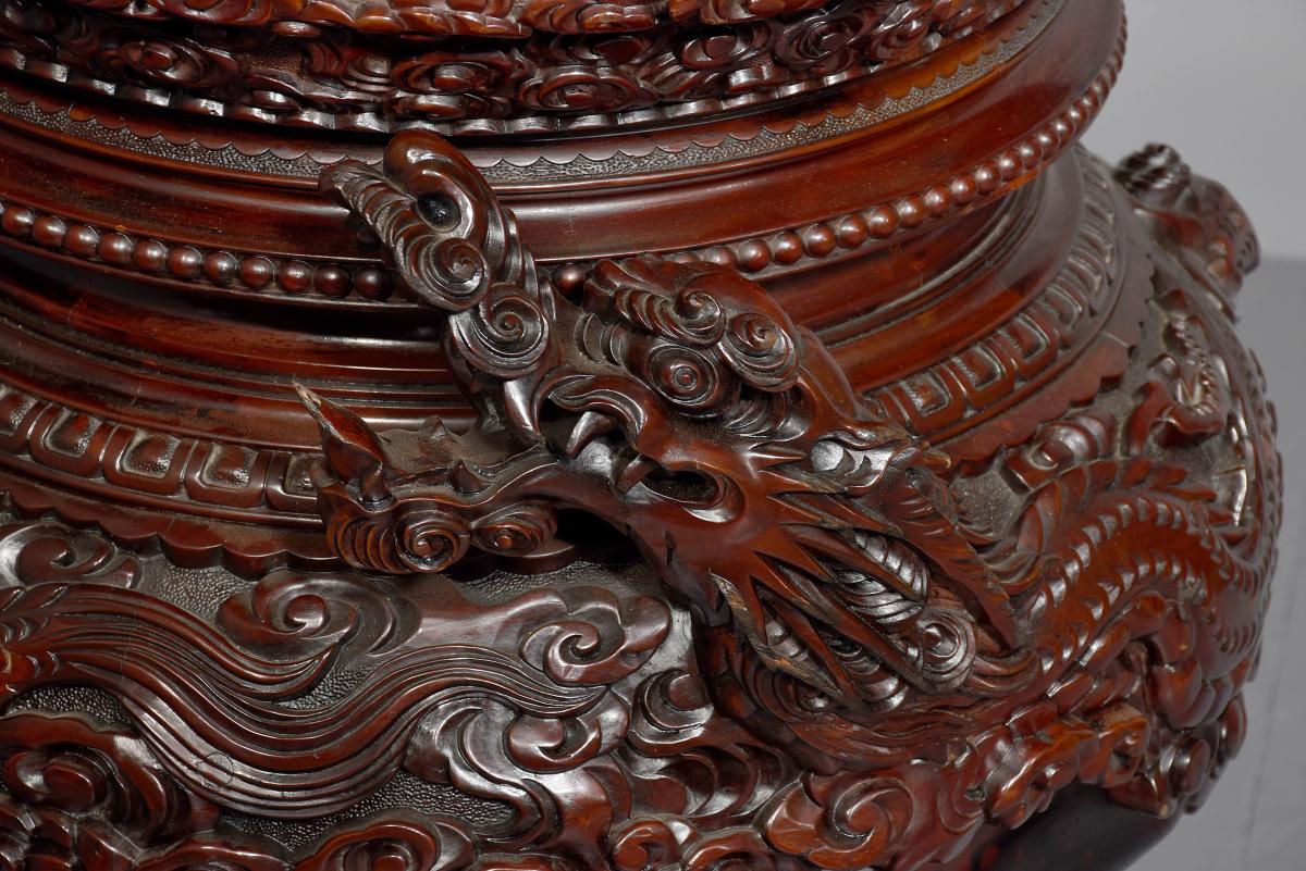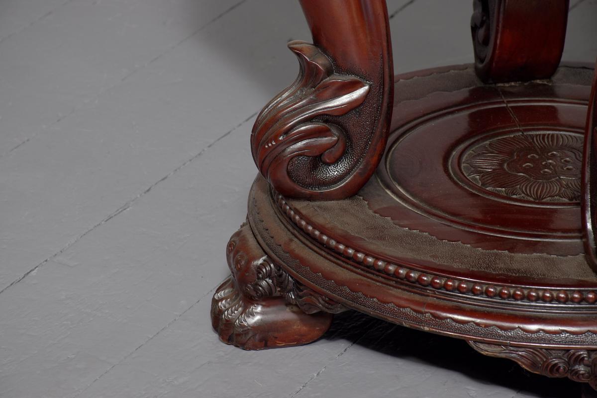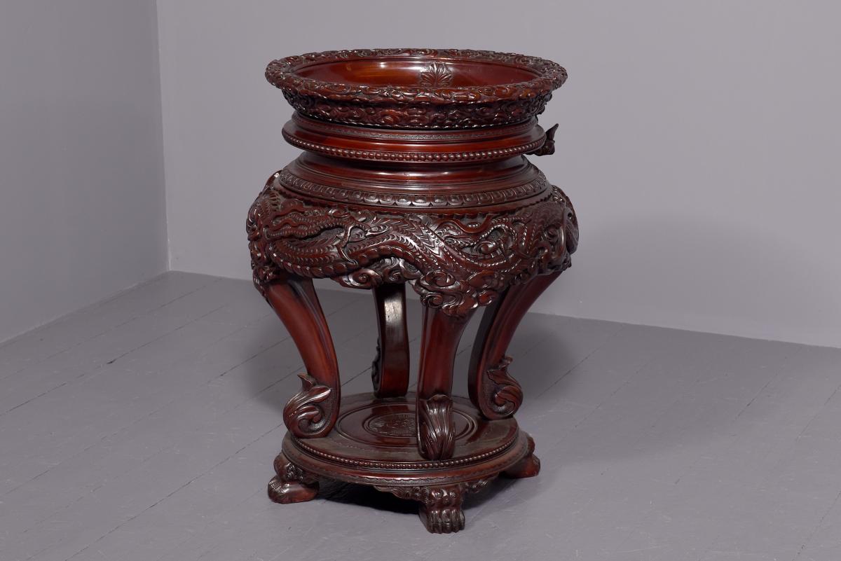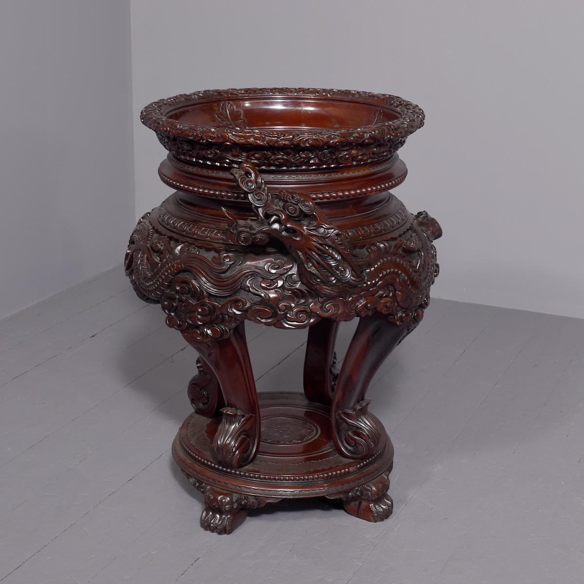Circa 1900. A Meiji period, stained jardinière of generous proportions, the dish shaped top with foliate carving on the inside and a profusely carved fore-edge, the outside with further carving and beading with a flared body entwined by a fully carved dragon with foliate carving to the sides, all resting on four elegant cabriole legs with foliate carved toes resting on a circular platform base with scratch and floral carving to the center, decoration on the sides sitting on four animal feet with carved quarter blocks, all with great colour, clean and sturdy.