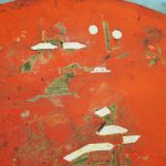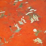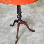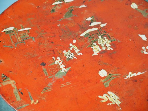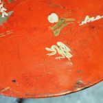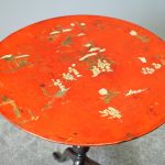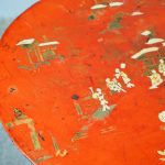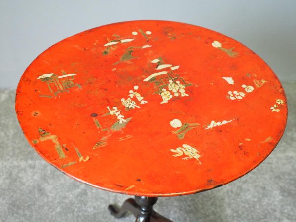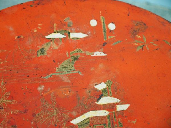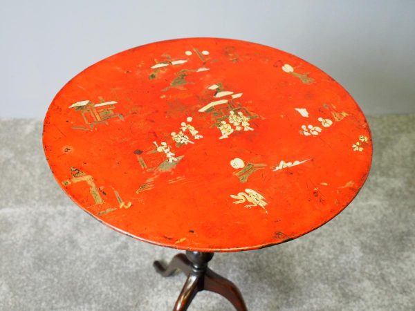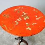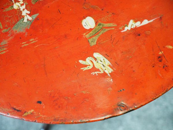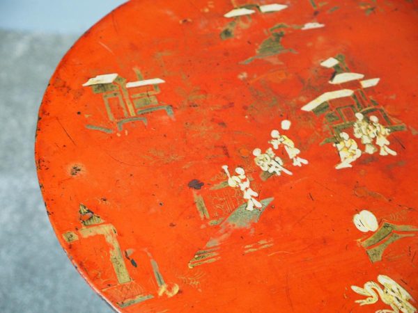 Late 1800s, unusual metal and hardwood Eastern occasional table in the English taste. The circular tin top with russet background and hand-painted Chinoiserie figures over a hardwood fluted turned stem and tripod supports.