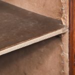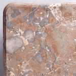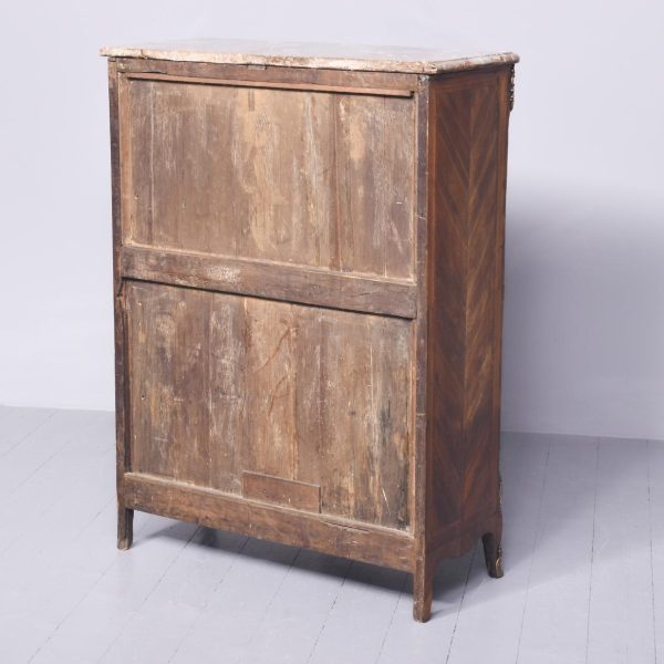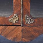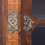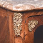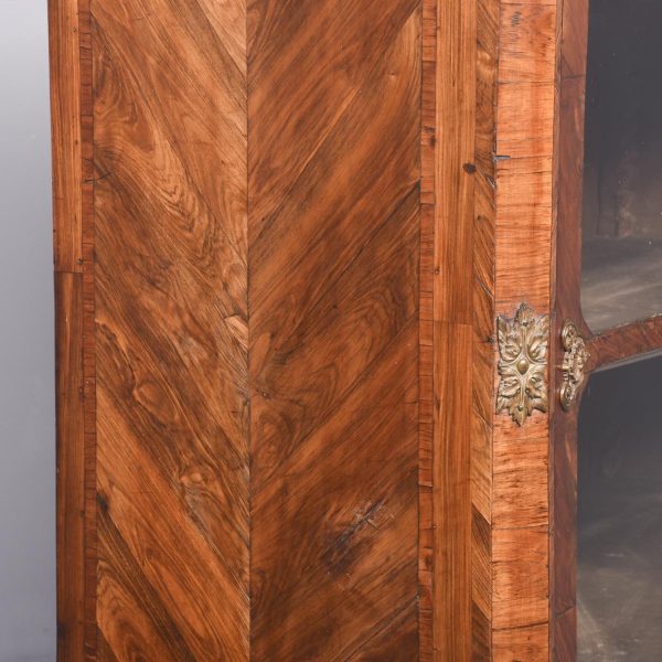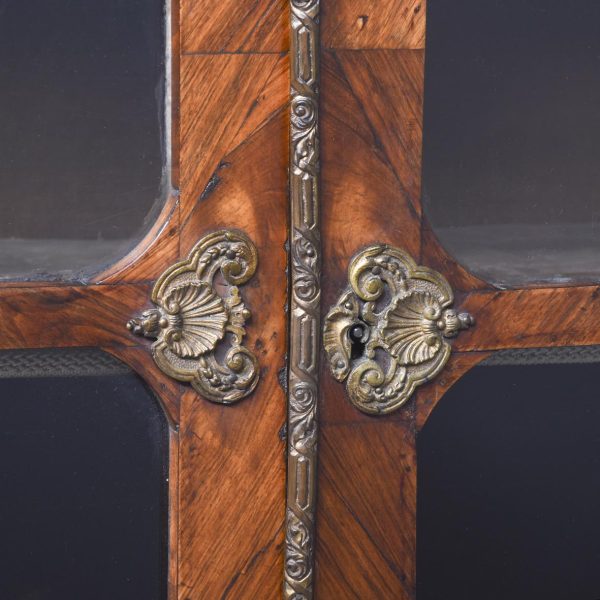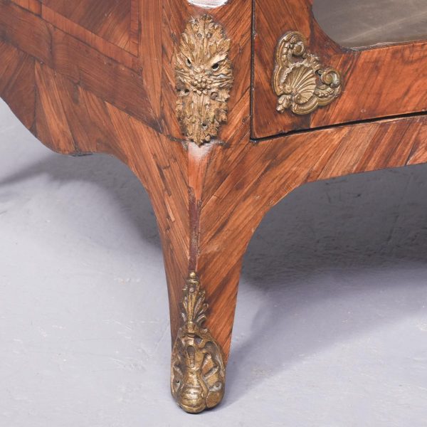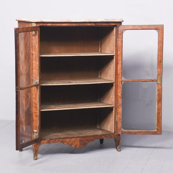 Circa 1850. Mid-19th century French figured walnut marble topped bookcase/cabinet. The variegated pink and grey top with a moulded serpentine front over the two-door cabinet with neo-classical cast brass mounts, including rococo scrolls and scalloped shells opening to three adjustable bookshelves. The canted sides with further cast brass mounts with mirror-matched walnut panels. All supported on short cabriole legs with brass sabots.