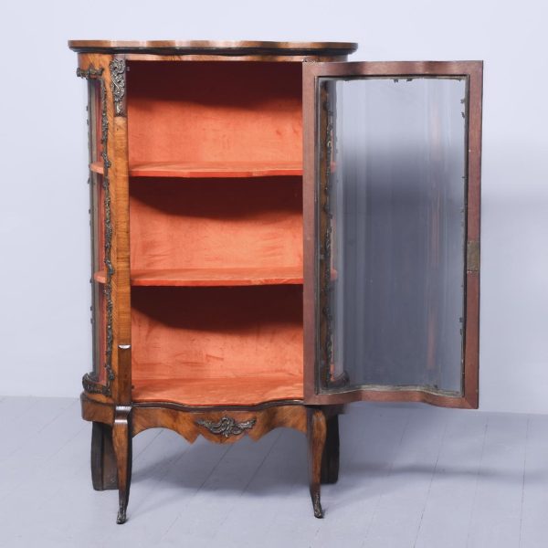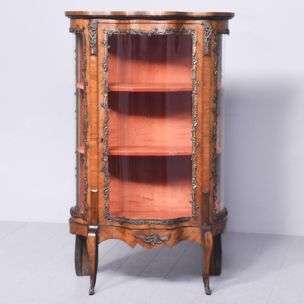 Circa 1850, ormolu-mounted French kingwood vitrine. The cabinet surmounted by a polished top with a crossbanded frieze over a shaped glass door with foliate, ormolu mounts opening to an upholstered (newly relined) and shelved interior.  The glazed bowfront sides with further ormolu mounts.  With a small apron with foliate mounts, and supported on tapering cabriole legs with ormolu sabots.