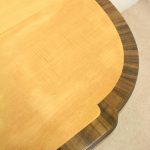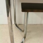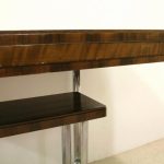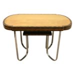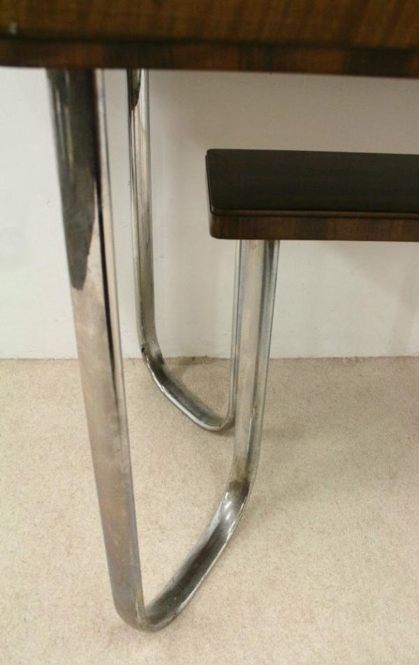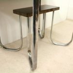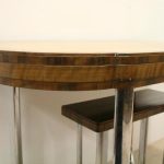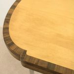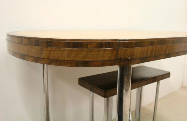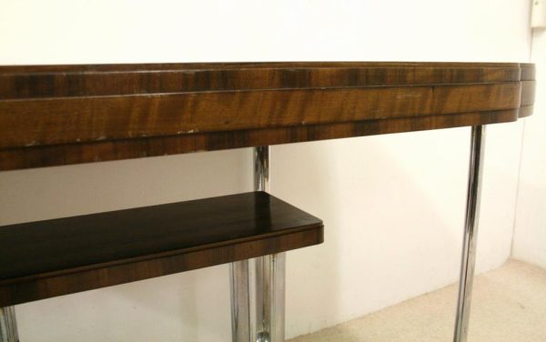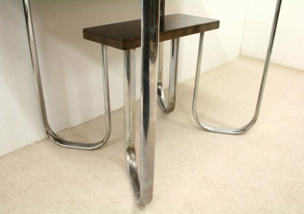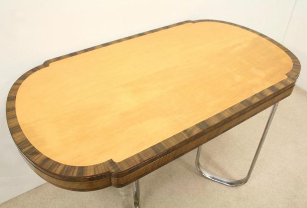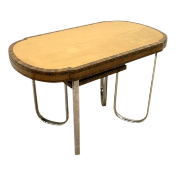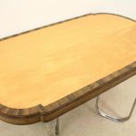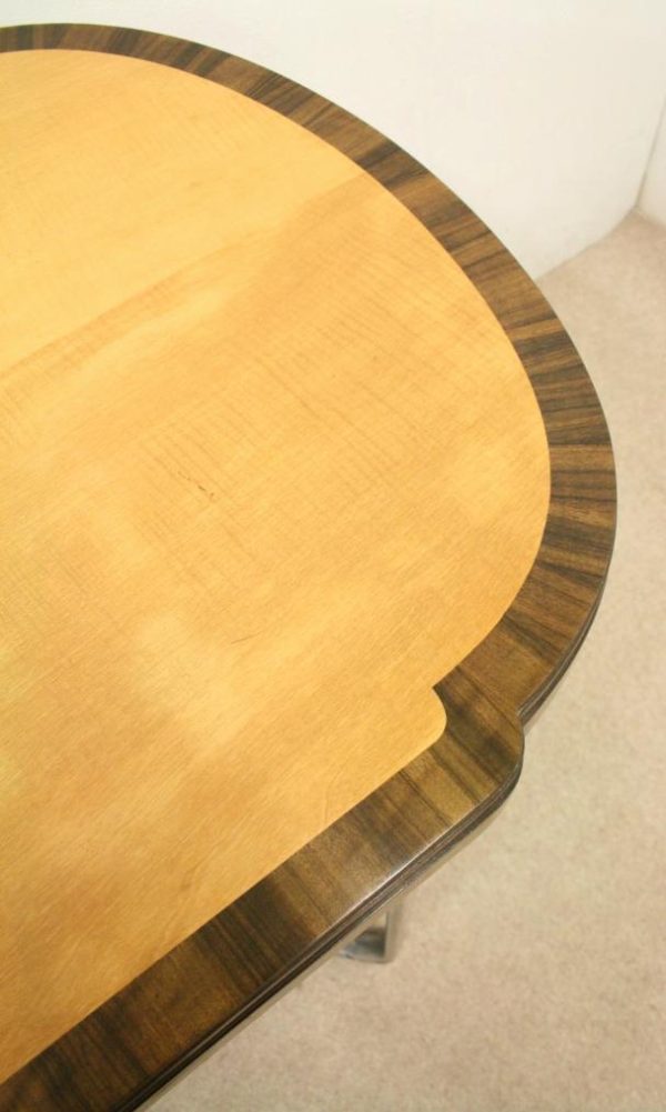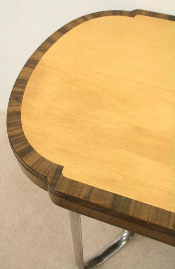 Circa 1950s, stylish and unusual maple and walnut table, probably by Heals of London. The maple veneered top is crossbanded in walnut. The edge of the table has a triple moulding with different coloured walnut on each level. The undercarriage has four flattened chrome tubes which protrude from underneath the table to a flat section to form the feet, and rise up to support an undershelf which is also veneered in walnut similar to the top. Very stylish and sturdy.
