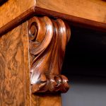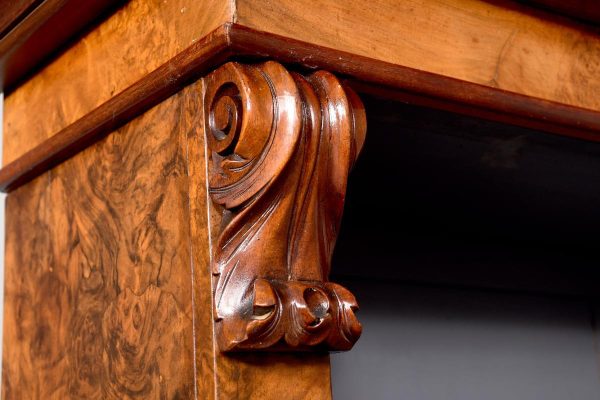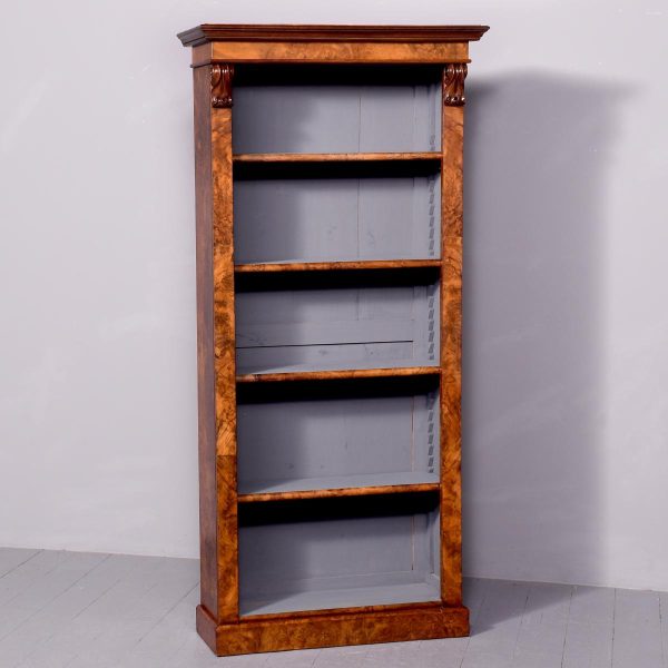 Circa 1860 with alterations. Mid-Victorian burr walnut tall open bookcase of desirable proportions. Surmounted by a moulded cornice over a burr walnut beaded frieze, the bookcase with 4 adjustable shelves with moulded walnut facings and flanked by tall pilasters with carved corbels to the top. All sitting on a neat, enclosed plinth base. Stylish, functional and in excellent condition.