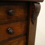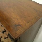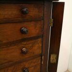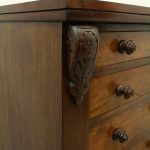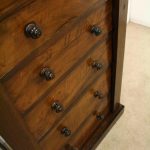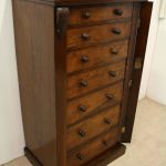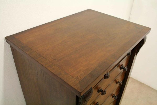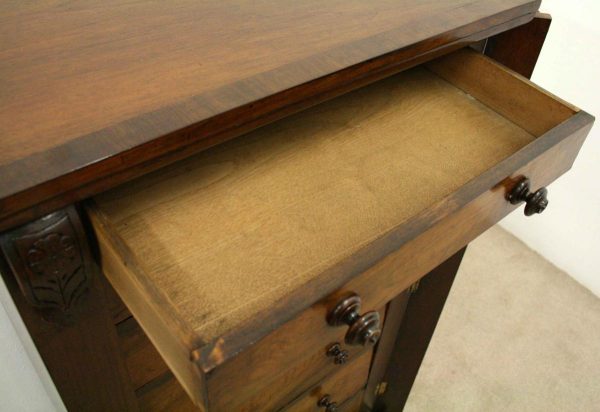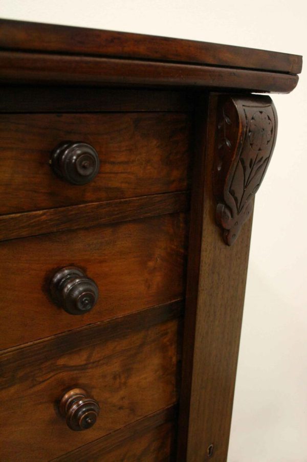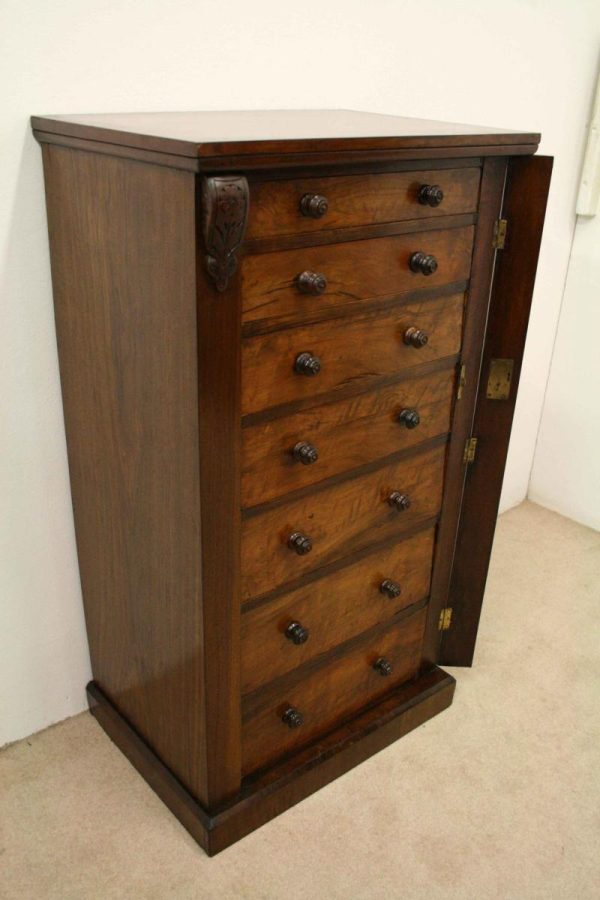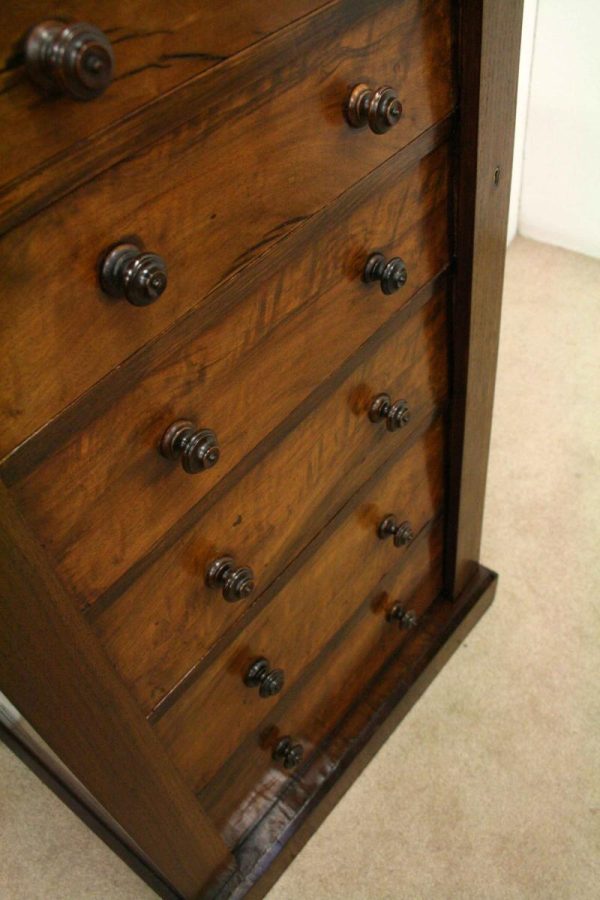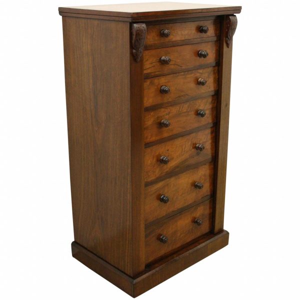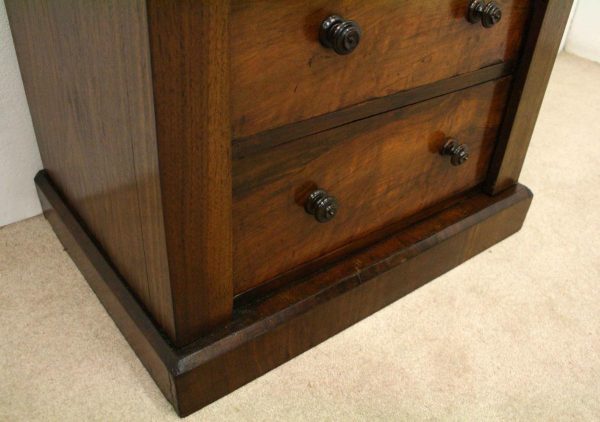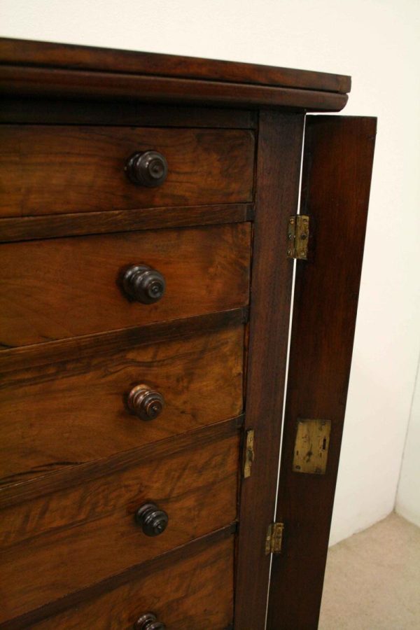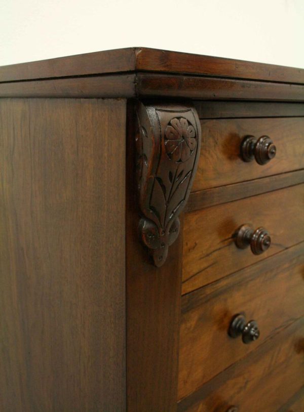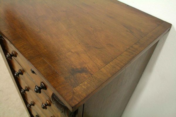 Circa 1880, mid Victorian figured walnut Wellington chest, the crossbanded walnut top above 7 graduated long drawers with finely turned handles and a locking slide, all standing on an enclosed plinth. Carved corbels to sides.