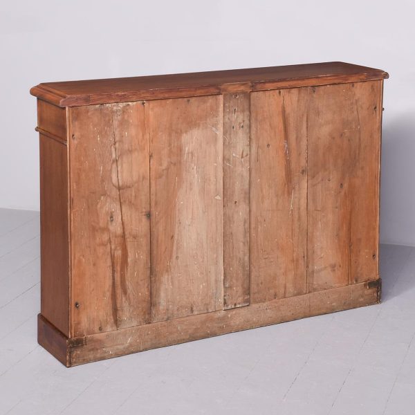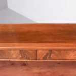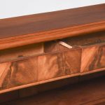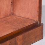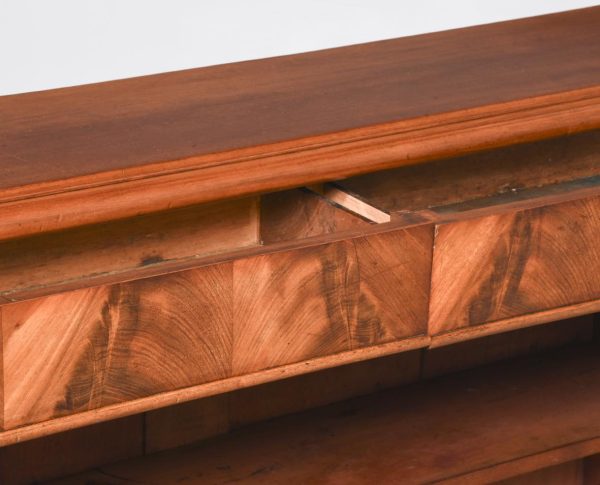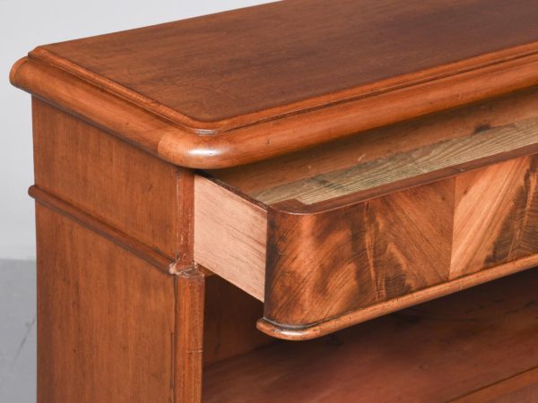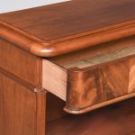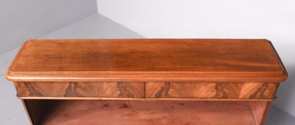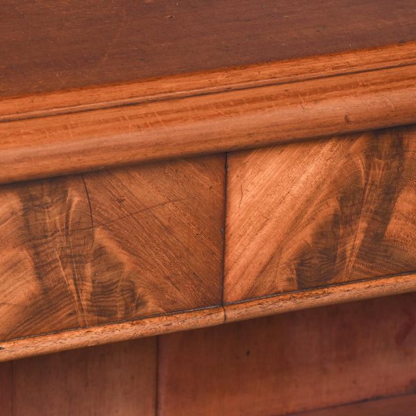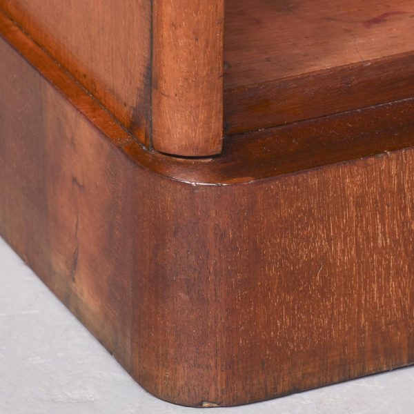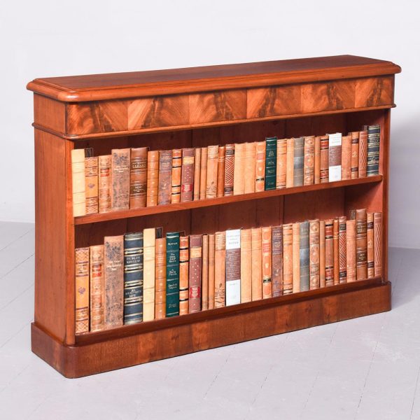 Circa 1850. Mid-Victorian mahogany, two-drawer open bookcase. The top with rounded corners and moulded fore-edges over two drawers with flame-mahogany drawer fronts. The open bookcase with one fixed shelf. All sitting on an enclosed plinth base.
