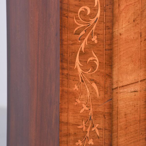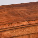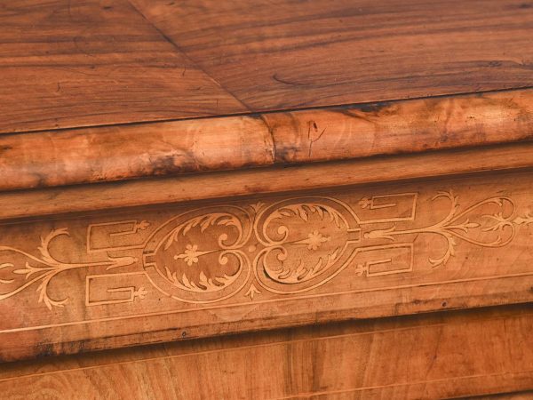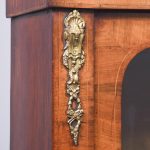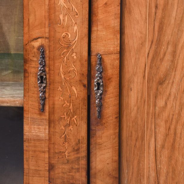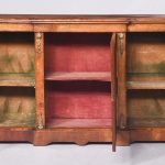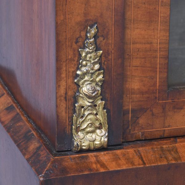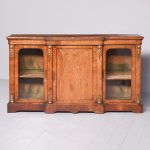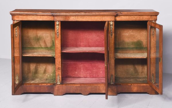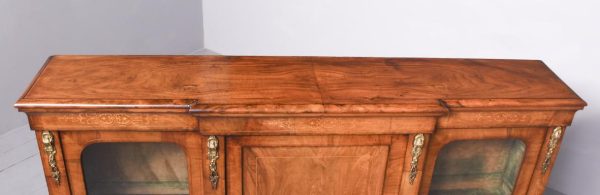 Circa 1850 Mid-Victorian marquetry inlaid three door break-front credenza. The top in mirror matched burr walnut with lovely colour and patina with a moulded foredge over a three layer marquetry inlaid frieze. The central door with a marquetry panel and the two glazed doors flanked and separated by inlaid pilasters with ormolu mounts. All sitting on an enclosed plinth base and in perfect condition