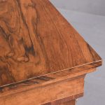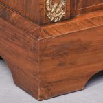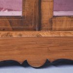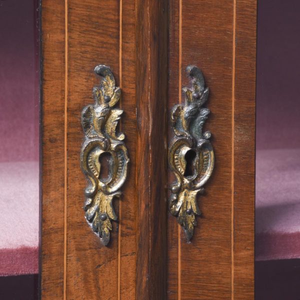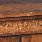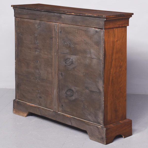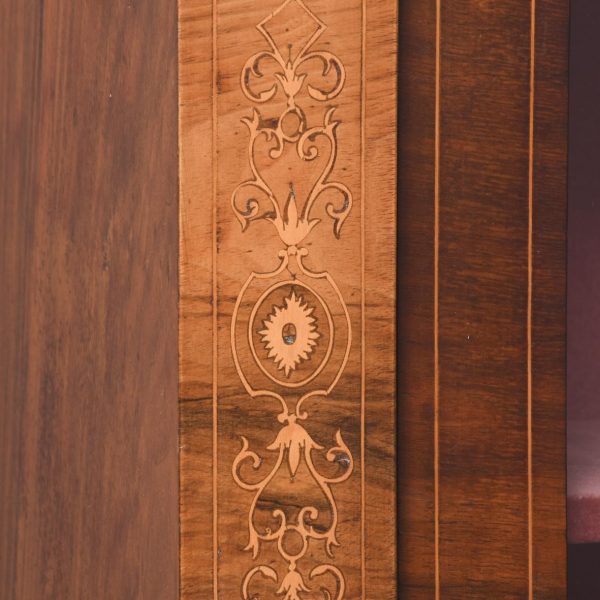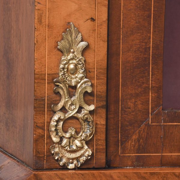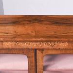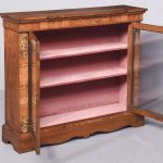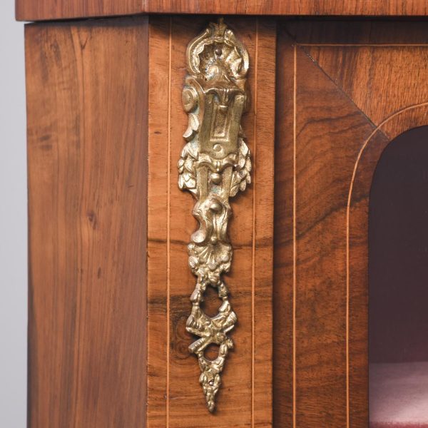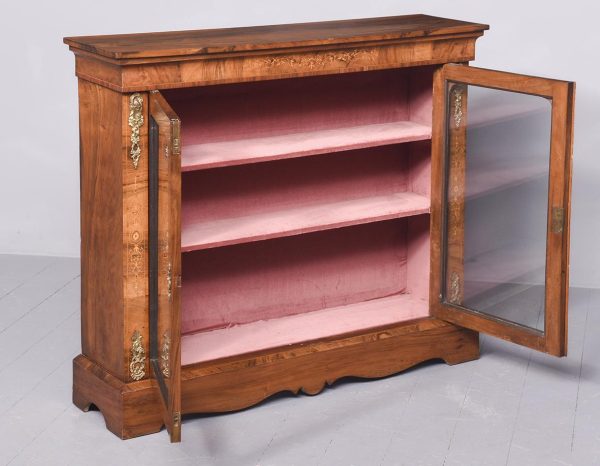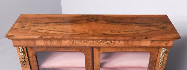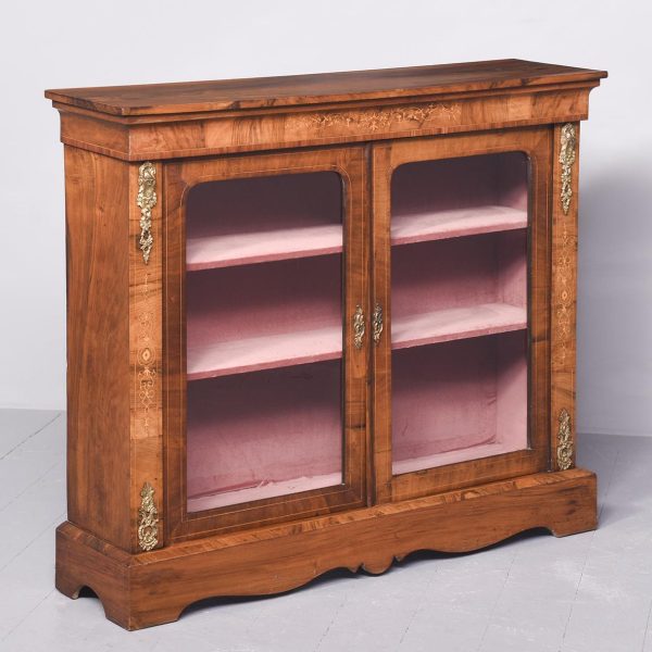 Circa 1860 Mid-Victorian marquetry inlaid two-door walnut credenza. The top in mirror-matched figured walnut with a curved frieze with foliate marquetry inlay and crossbanding. The two inlaid doors with ormolu escutcheons opening to a shelved interior and flanked by pilasters with marquetry inlay with ormolu mounts. All on a partially enclosed plinth base. In excellent condition