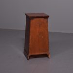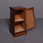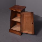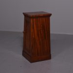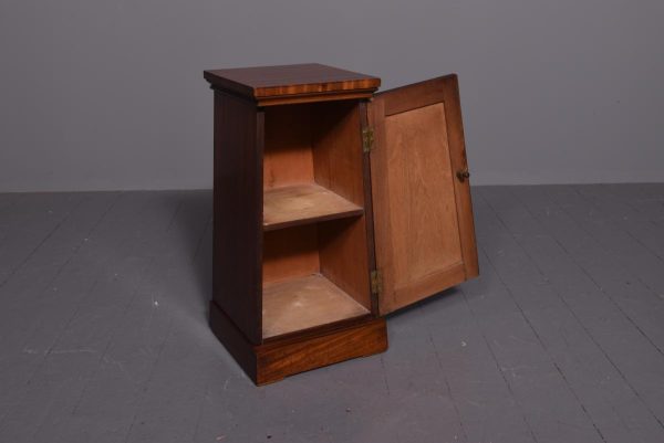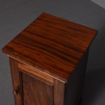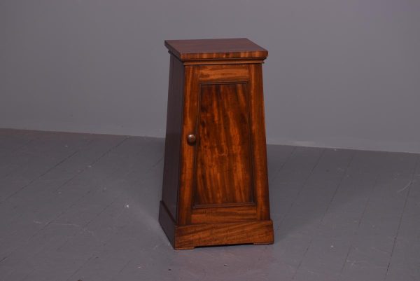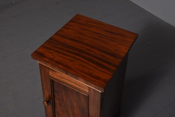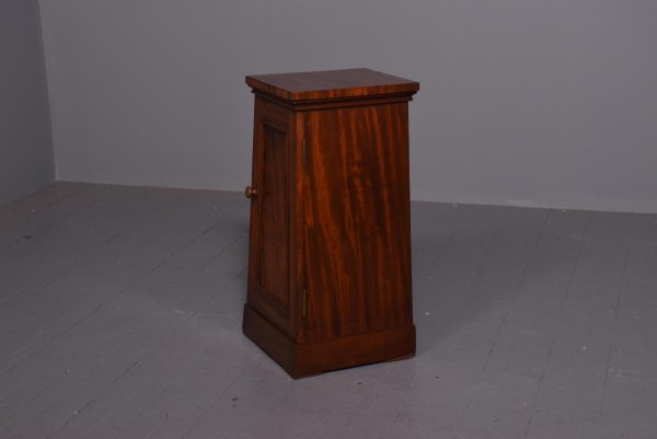 Circa 1750. Mid Victorian metronome-shaped bedside locker in figured Spanish mahogany. The rectangular top with traditionally restored French polish over a single panelled door, with original knob handle, opening to a shelved interior all supported on an enclosed plinth base.