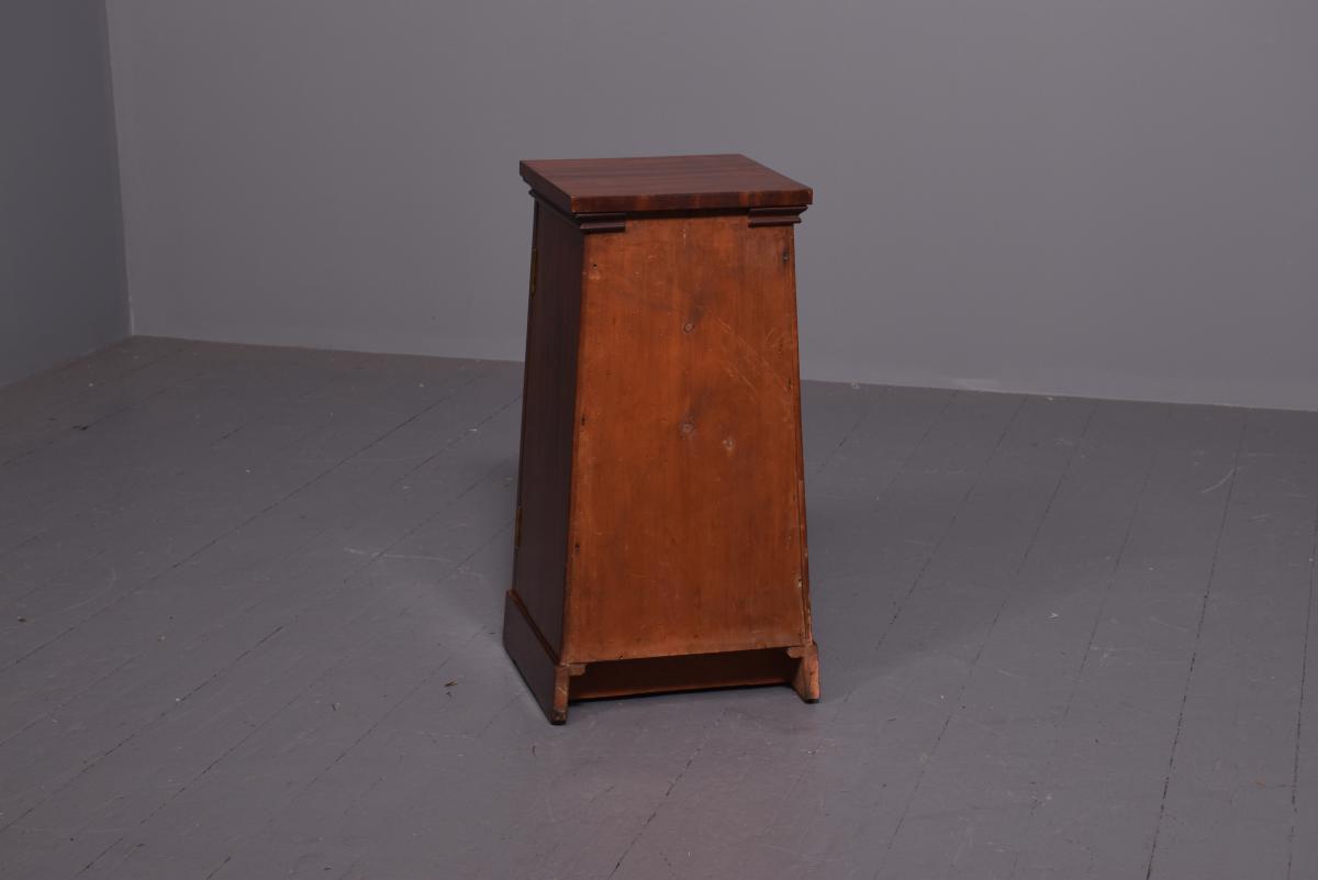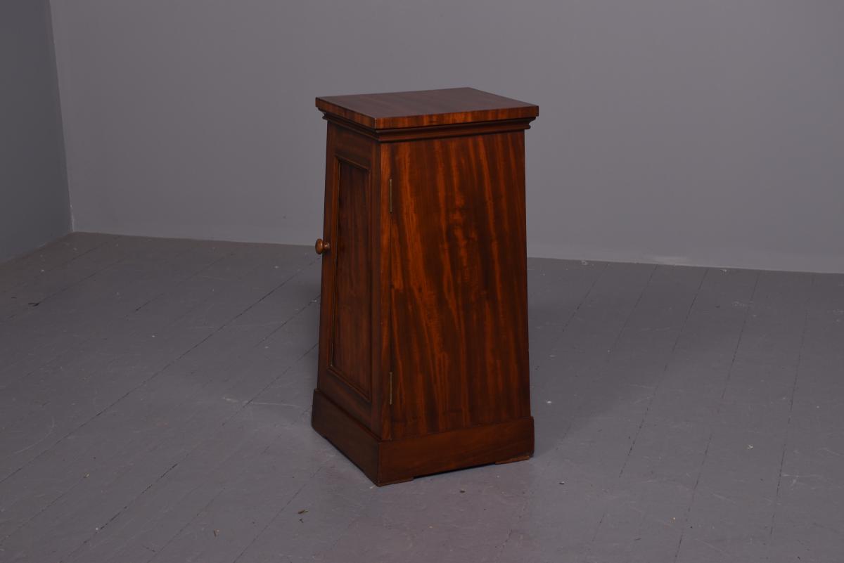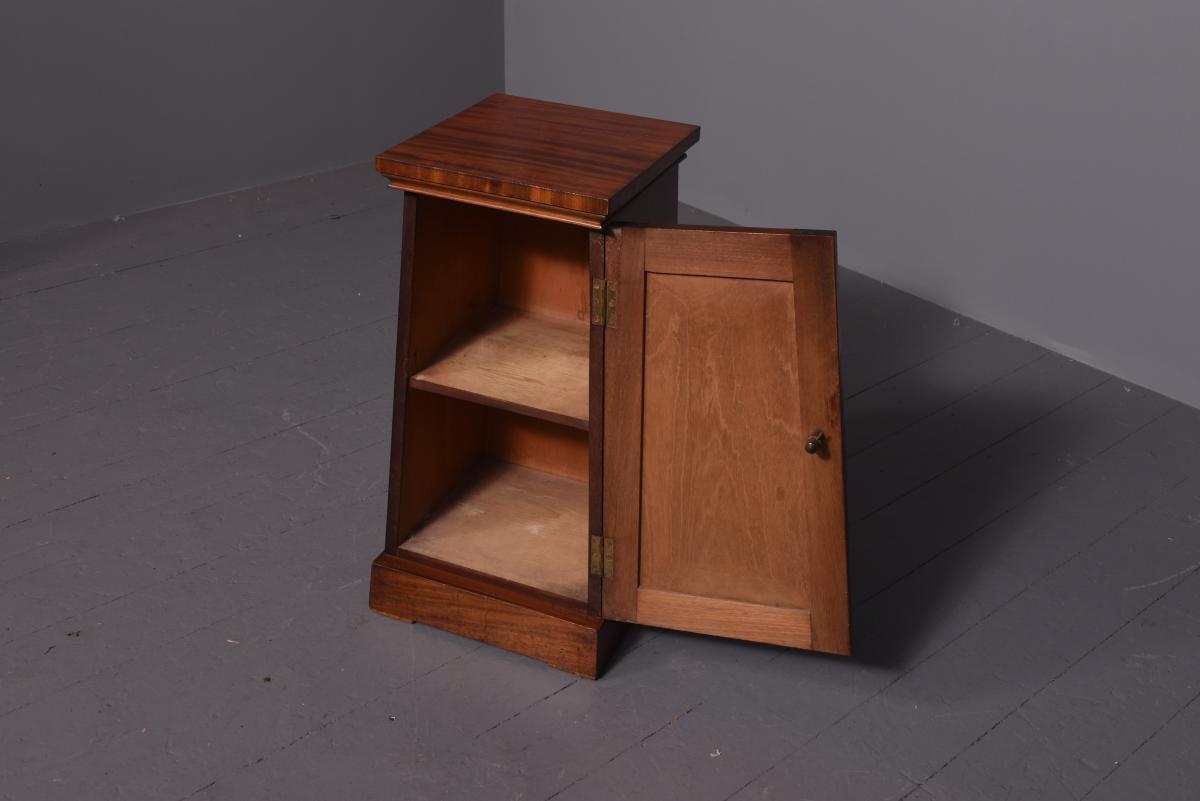 Circa 1750. Mid Victorian metronome-shaped bedside locker in figured Spanish mahogany. The rectangular top with traditionally restored French polish over a single panelled door, with original knob handle, opening to a shelved interior all supported on an enclosed plinth base.