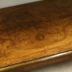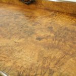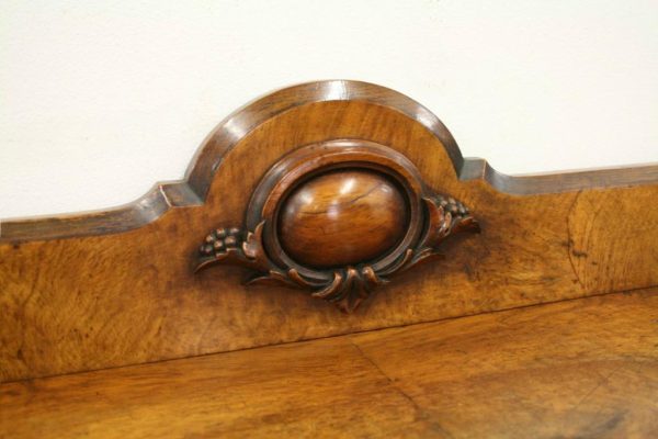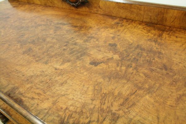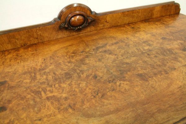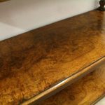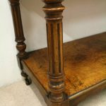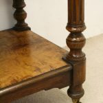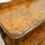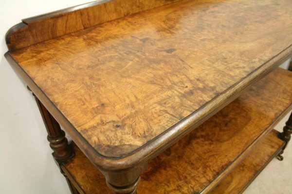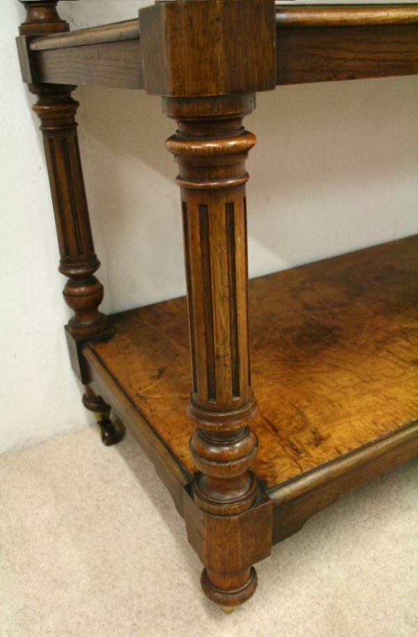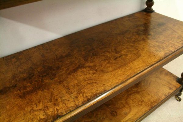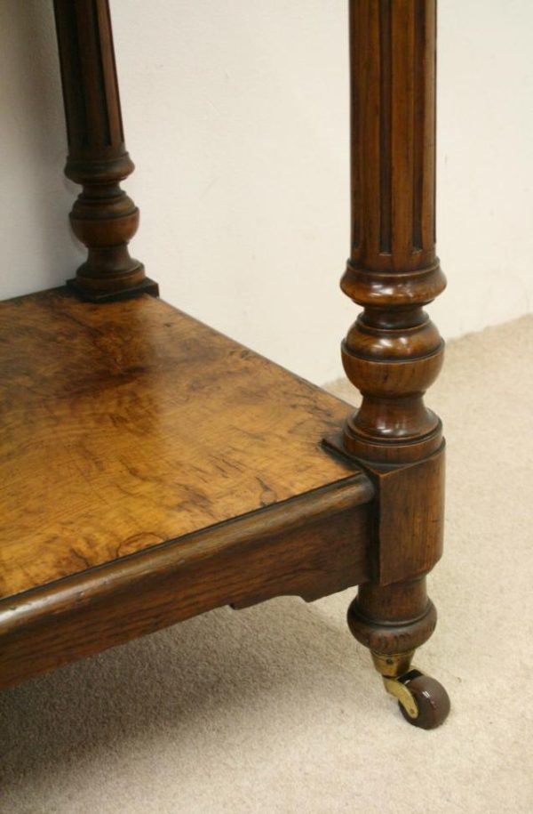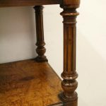 Circa 1860, mid Victorian three tier pollard oak whatnot/buffet surmounted by a small shaped back with finely carved floral motif in the centre, supported by turned and fluted uprights. Exceptionally nice figured wood.