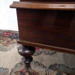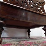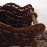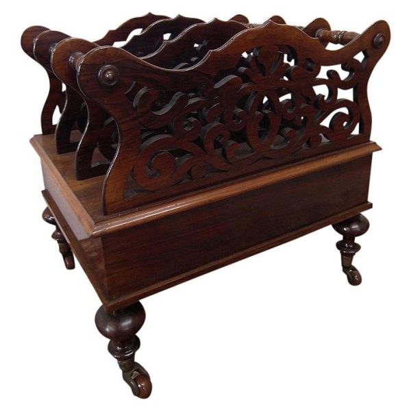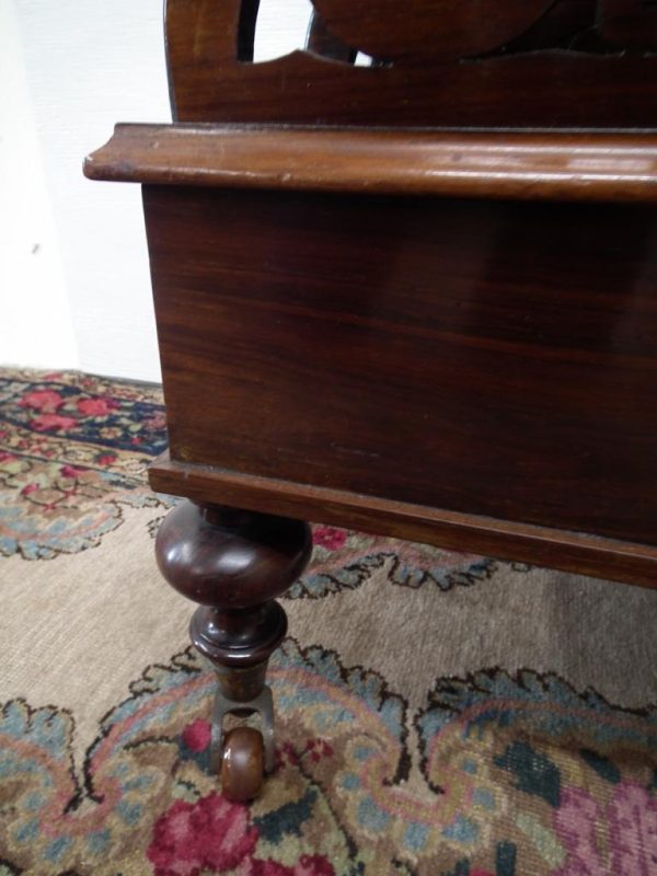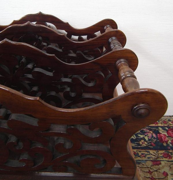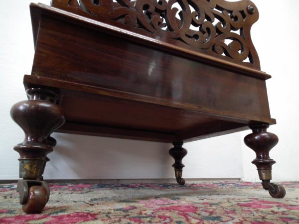 Circa 1860, mid Victorian rosewood three division Canterbury. The shaped top with open pierced fretwork divisions with nice turned rosewood bobbins, below is one large drawer, standing on four bulbous feet finishing on brass tipped castors with porcelain wheels. Excellent condition.