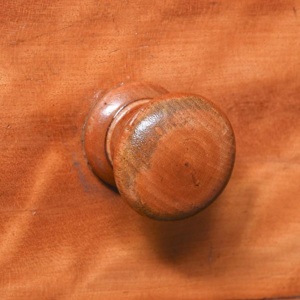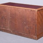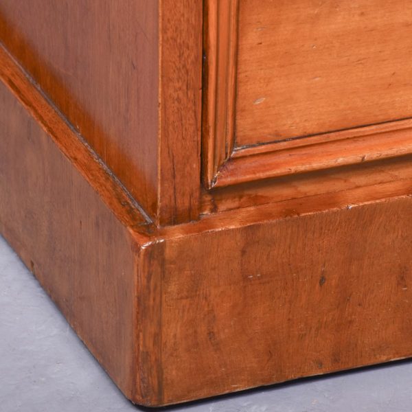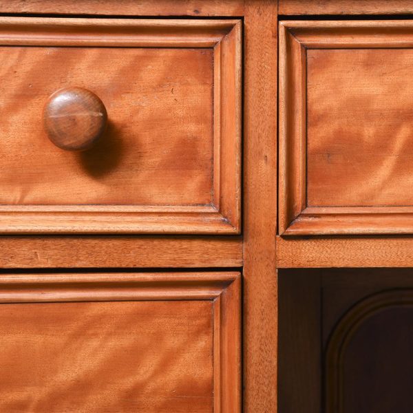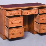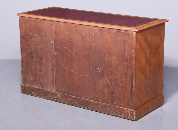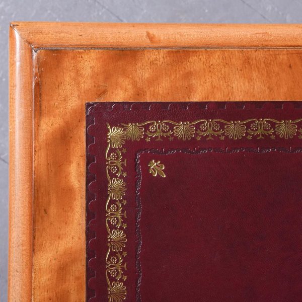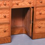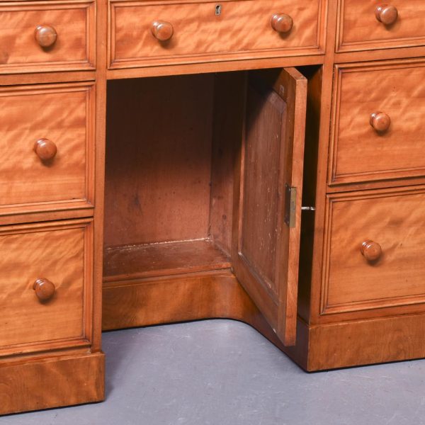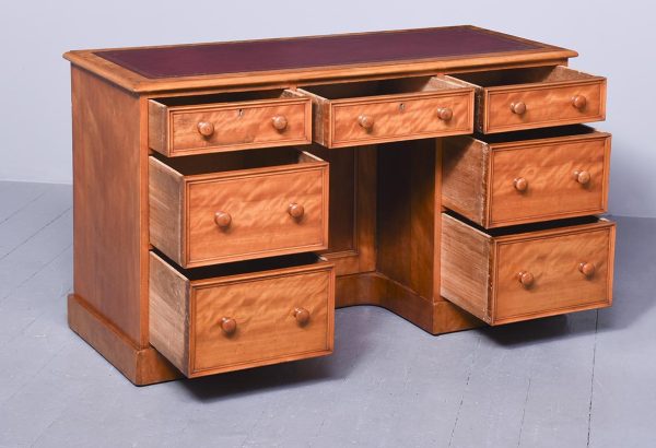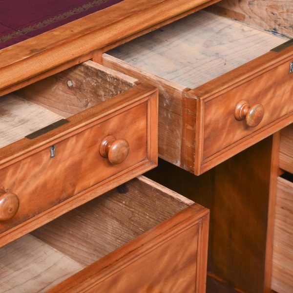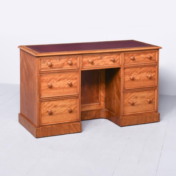 Circa 1880. Mid Victorian satin birch knee hole writing desk with an attractive golden colour and patina. The top with a gilt tooled burgandy writing surface above three frieze drawers with moulded fronts and original finely turned knobs supported on banks of drawers surrounding a knee hole recess, all on an enclosed plinth base. in excellent condition.