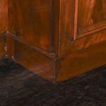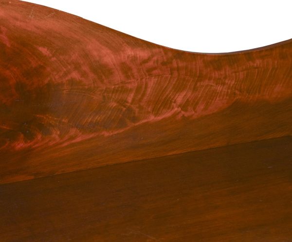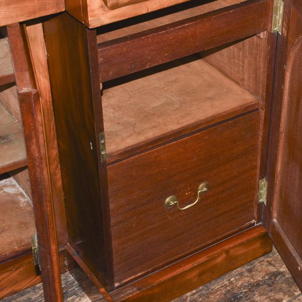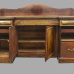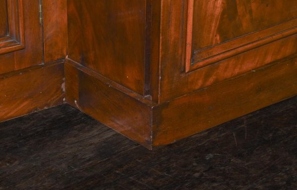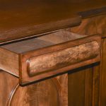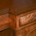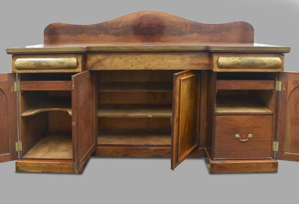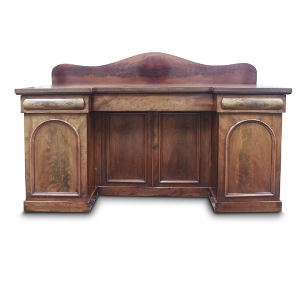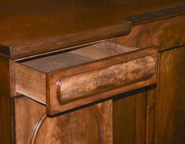Circa 1860. A mid-Victorian Scottish four door mahogany sideboard. The top in flame mahogany with a shaped raised back in book-matched flame mahogany, the front with one long drawer flanked by a pair of drawers with convex panels of flame mahogany, the base with four cupboards, two arched and two with square panels, inside there are various fittings and shelves, wine box.