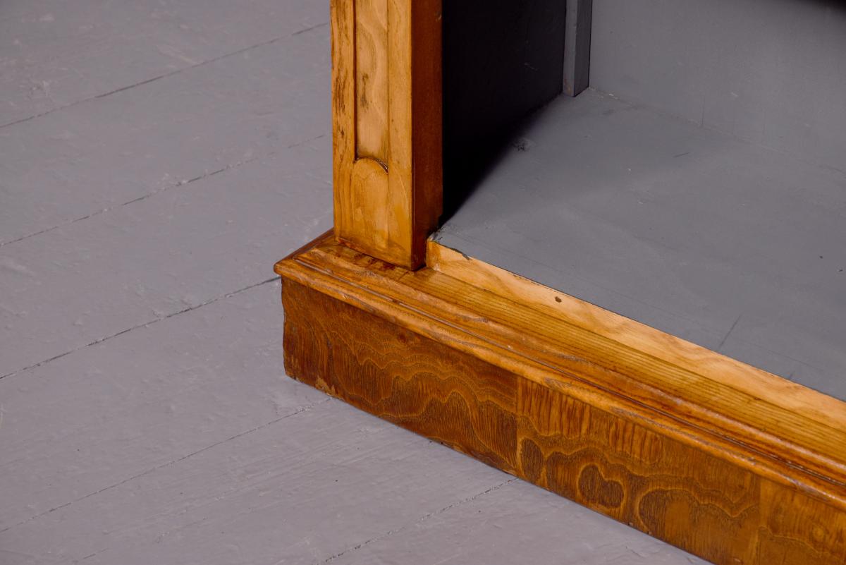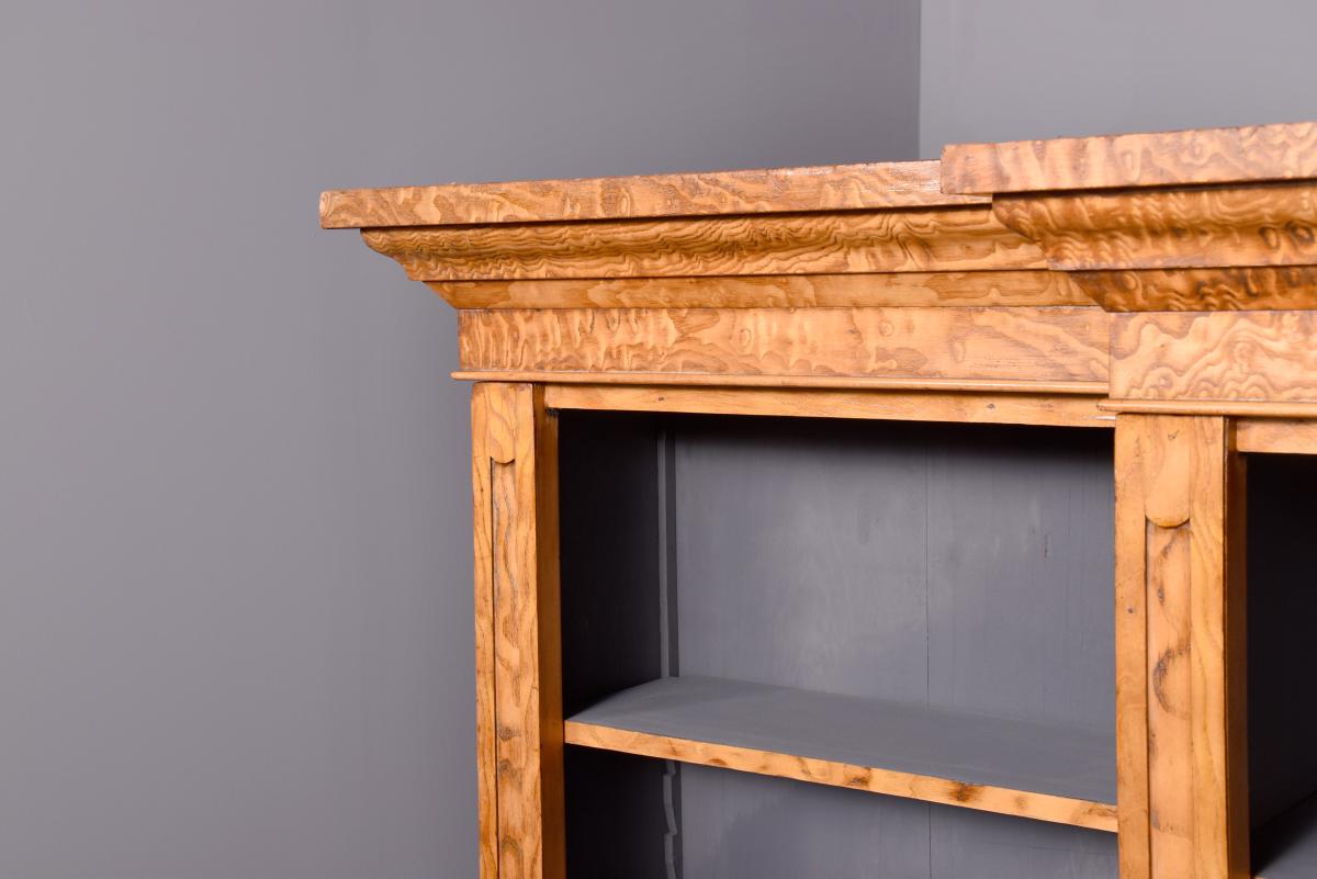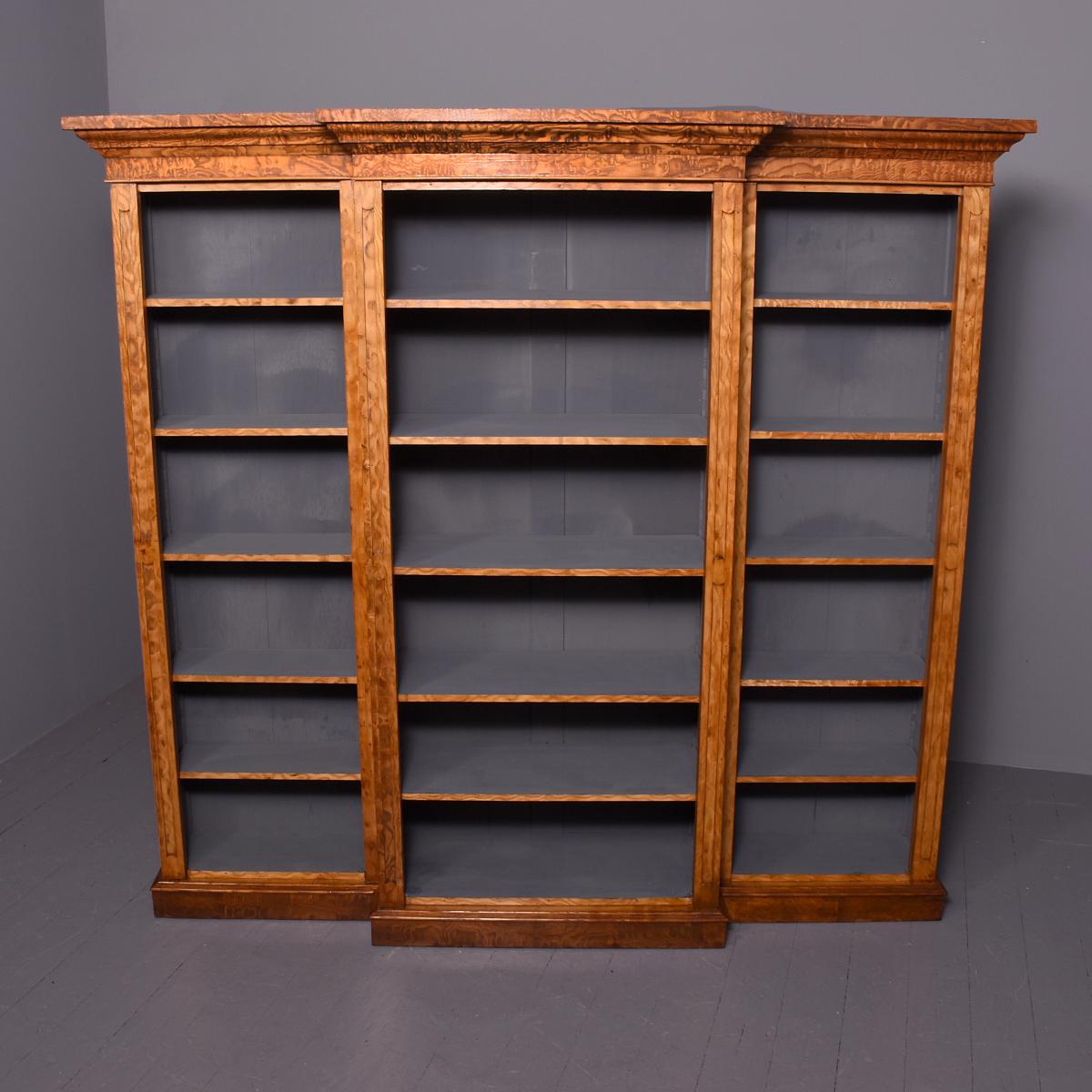 Circa 1870 with alterations. . Surmounted by a moulded cornice and frieze in wonderfully figured golden elm, the bookcase in three sections, each with five adjustable shelves, and deeper shelves more centrally, all flanked and separated by tall pilasters. Supported on a breakfront moulded enclosed plinth base. Attractive and functional in a modern or traditional setting and in perfect condition.
