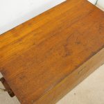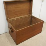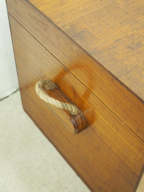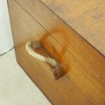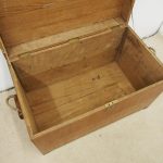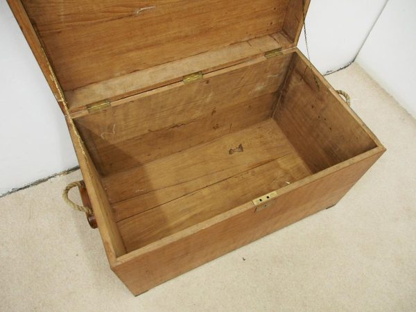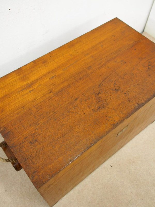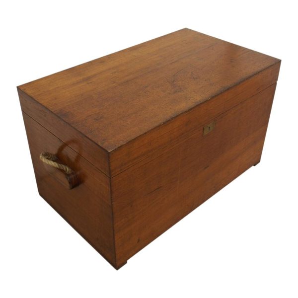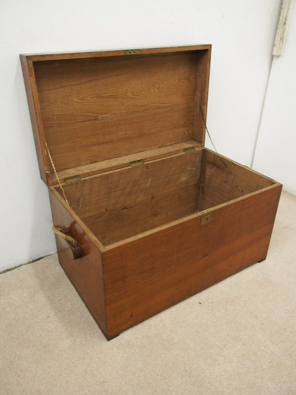 Circa 1880, Anglo-Indian mid Victorian teak ships trunk. With unusual block and rope carrying handles to the sides, rectangular brass escutcheon and a brass English lock.