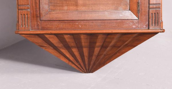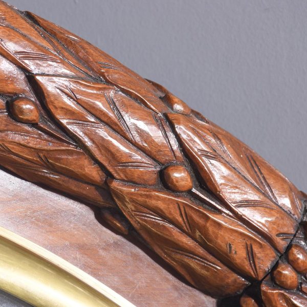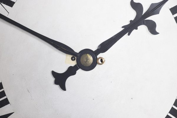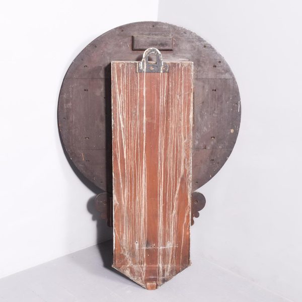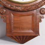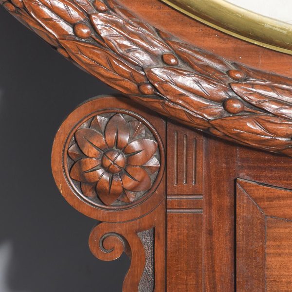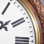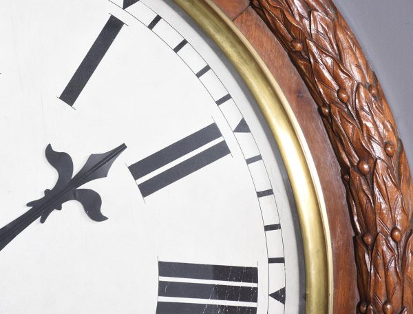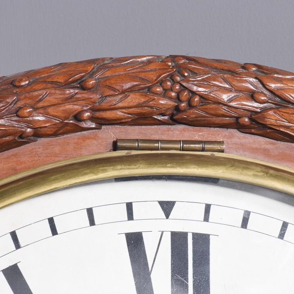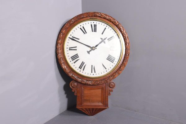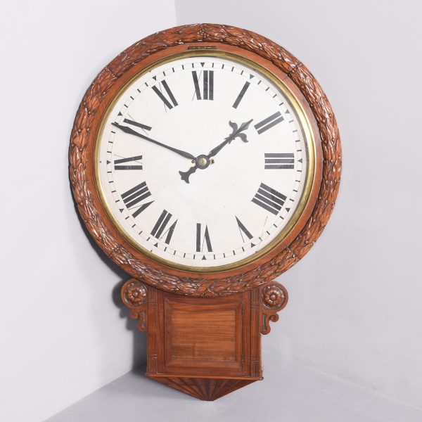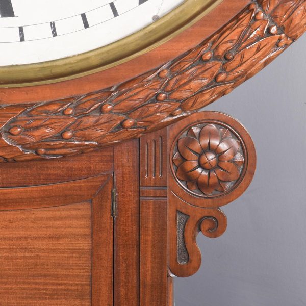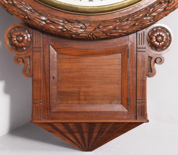 Circa 1850. An early Victorian mahogany circular drop dial fuse movement, striking wall clock of monumental proportions. The large circular mahogany frame with foliate carving, white painted dial with Roman numeral and a pair of stylish cut hands, with two winding holes, and a cast brass bezel, the base section with a panel door flanked by a pair of carved flower-heads, base and bottom taper and have a lovely wave pattern. The clock will be serviced and running.