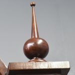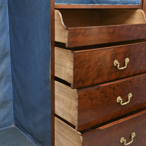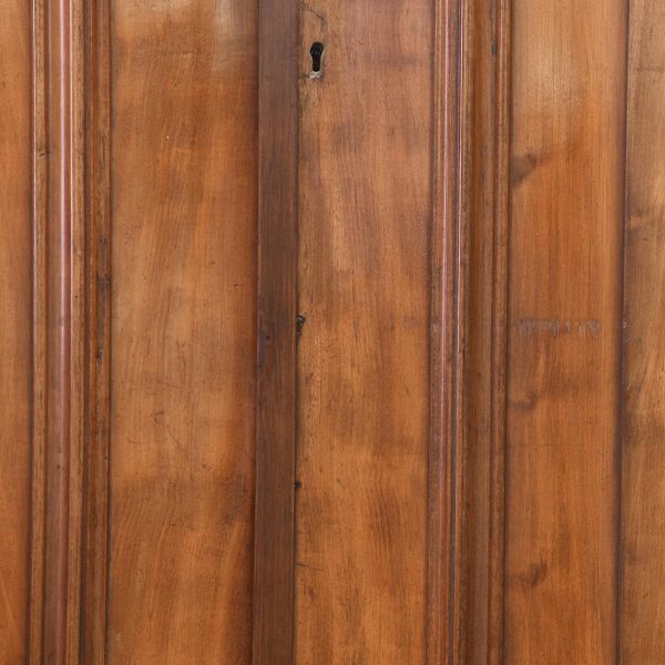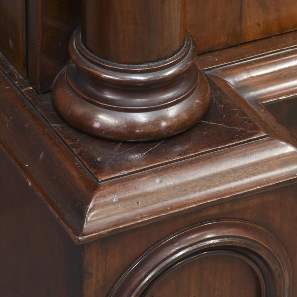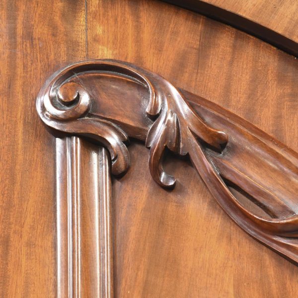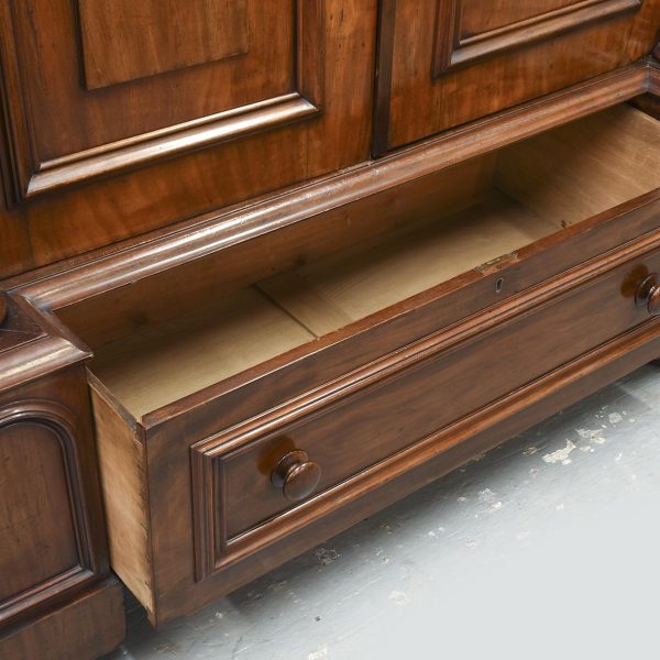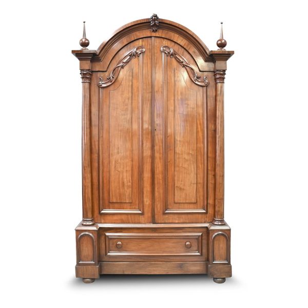 Circa 1870. A monumental mid Victorian two door dome top mahogany wardrobe. The cornice with foliate carving on the top and two large finials each side. Pair of arched doors with raised panels and foliate carving on the top with full Tuscan columns each side, with capitals and a simple base. Inside there is a storage section in the top, uninterrupted hanging on the left and a mixture of hanging and drawers on the right-hand side. Beneath the two doors there is further mouldings and a breakfront section, and in the base one full length drawer with turned knob handles, with a simple frieze beneath, the robe stands on four squat bun feet.