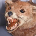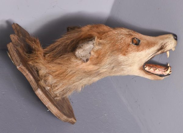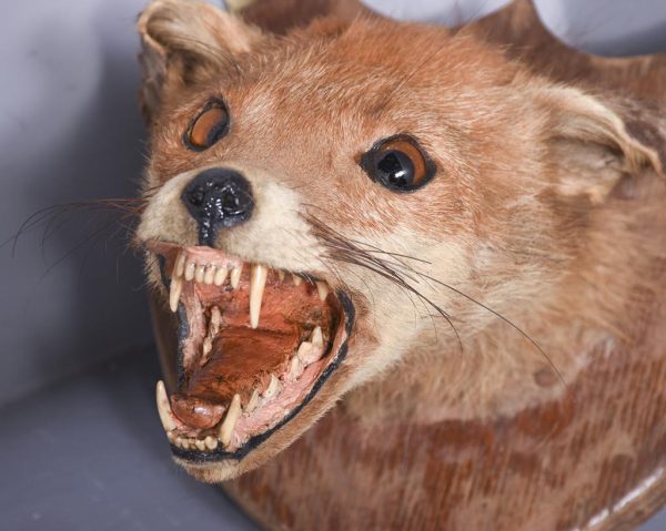 Circa 1920s. A recently restored fox head mounted on a simple heraldic shaped shield.