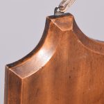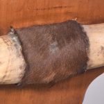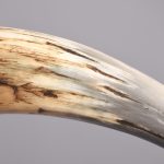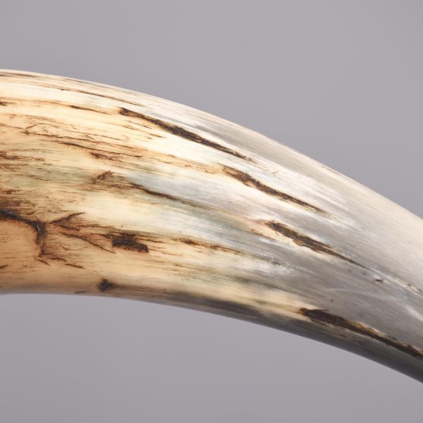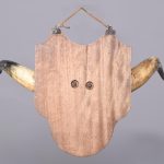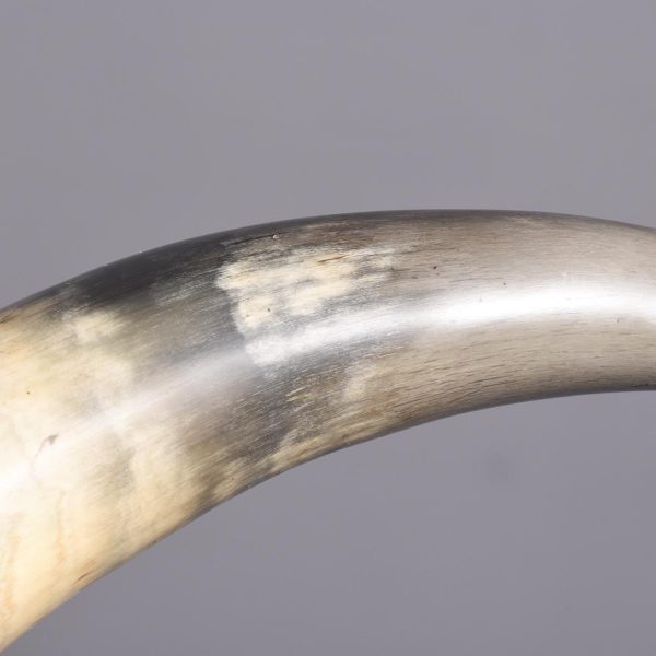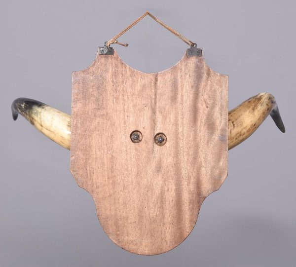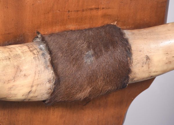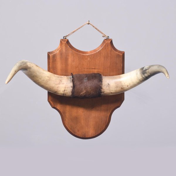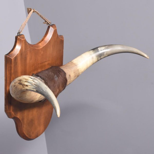 Circa 1900. Mounted large cow horns with central hide decoration on a shaped mahogany shield. Large impressive pair of horns. Decorative item!