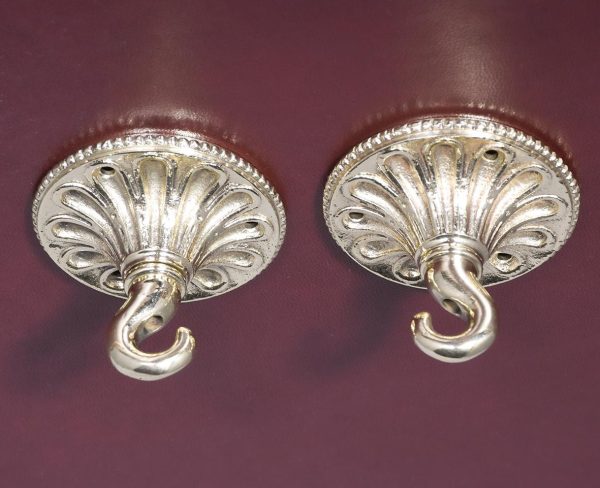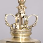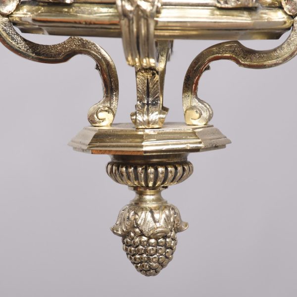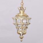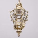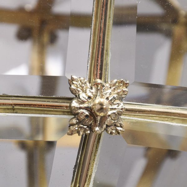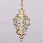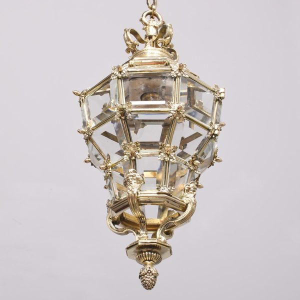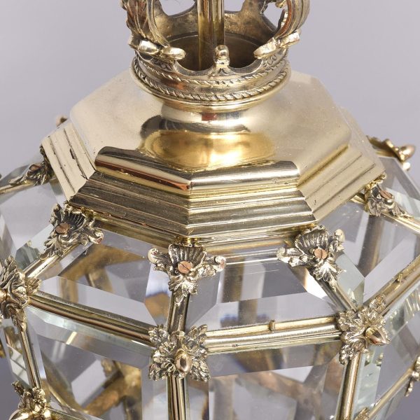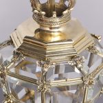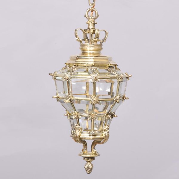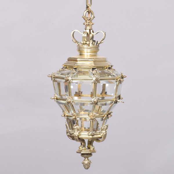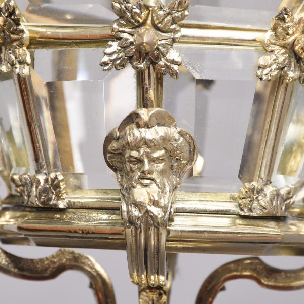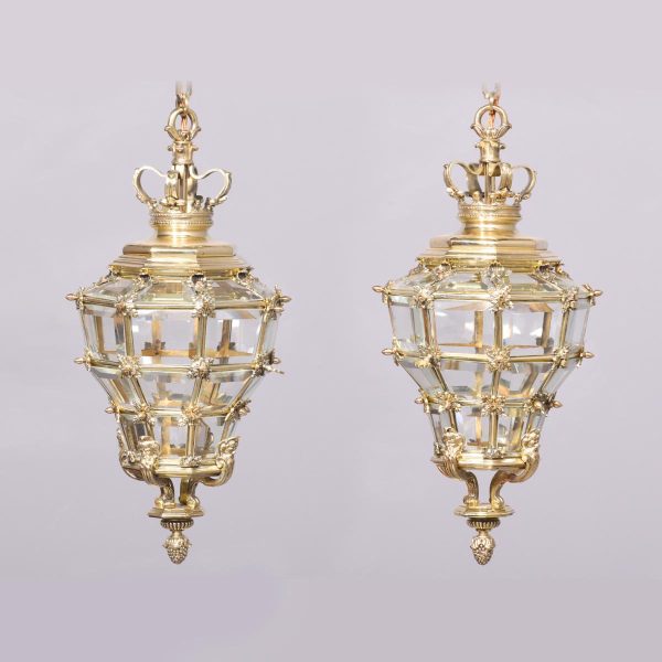 Circa 1890. A magnificent pair of ormolu lanterns of hexagonal form, surmounted by a pierced crown with shaped bevel glass concealing an access door, with the held in place by gilded square flower heads, the tapering body with 4 classical masks terminating on a down facing finial. Includes chain and ceiling mount.