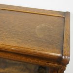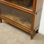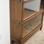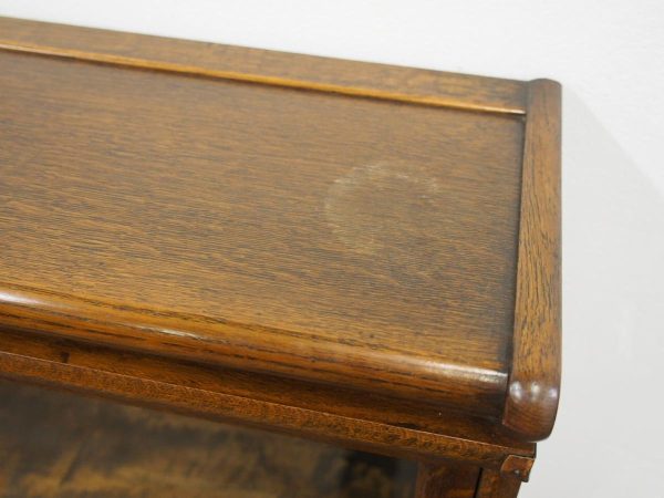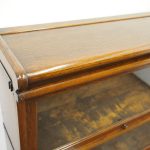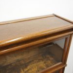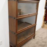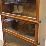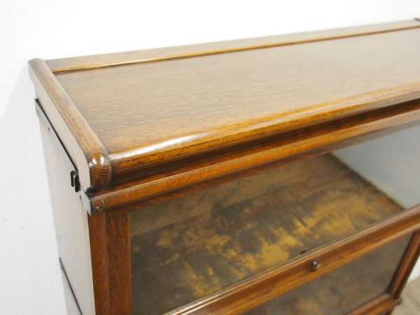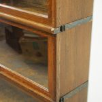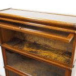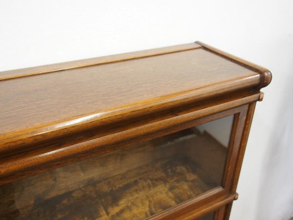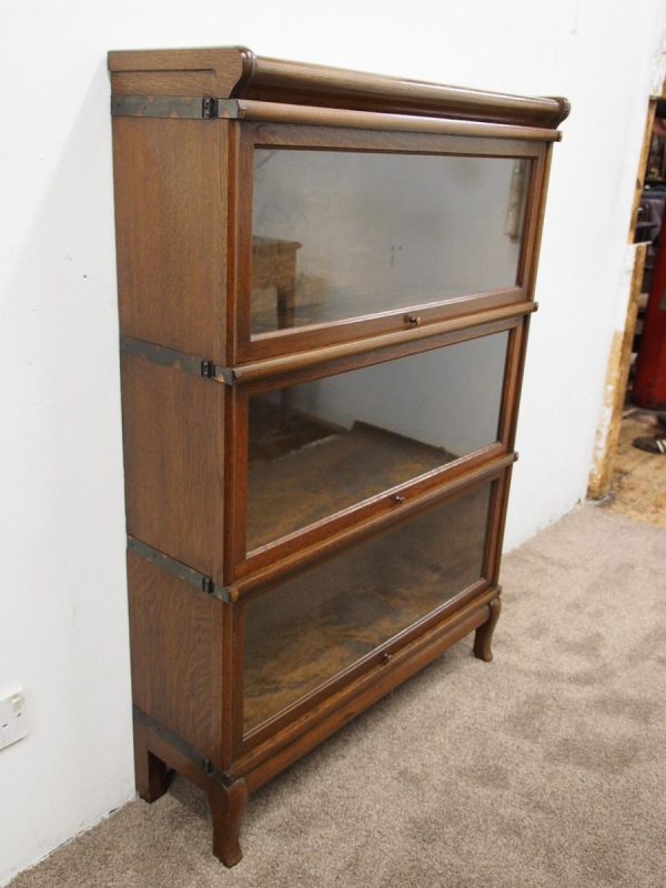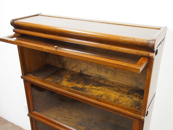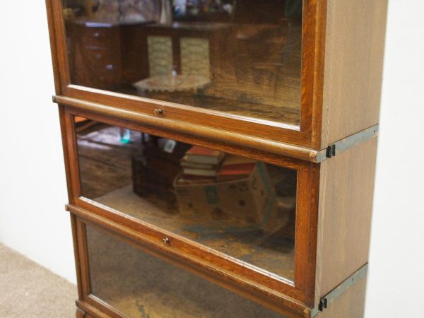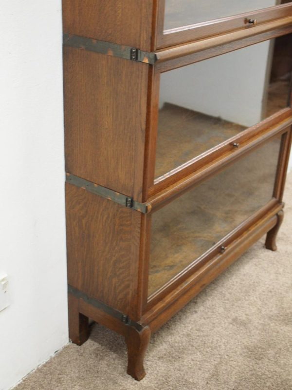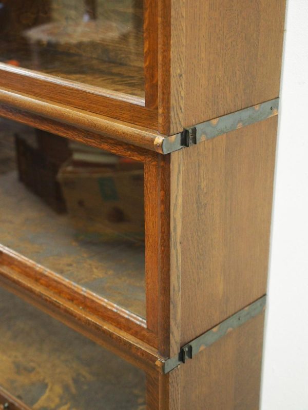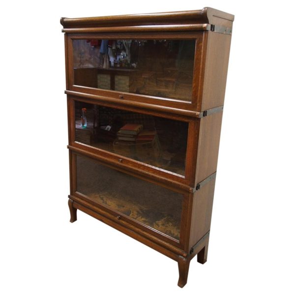 Circa 1920, neat sized sectional bookcase in figured quarter-cut oak. The polished top with a moulded fore edge sits over the three upward lifting glazed doors with copper knobs. It has oxidised copper banding to sides and is all over neat shaped base and shaped supports.