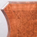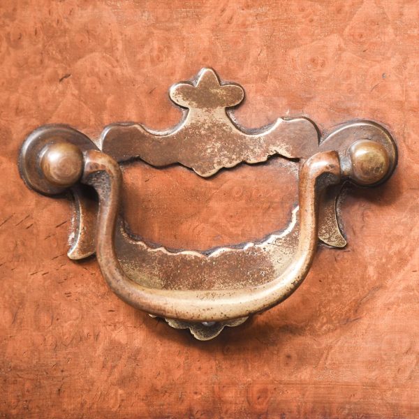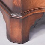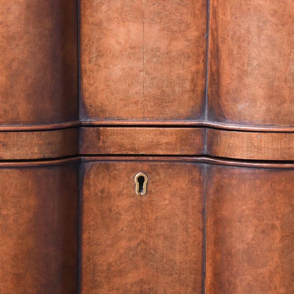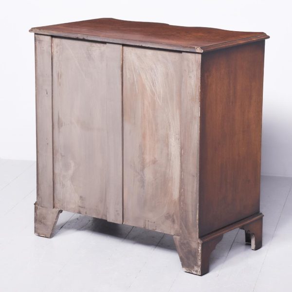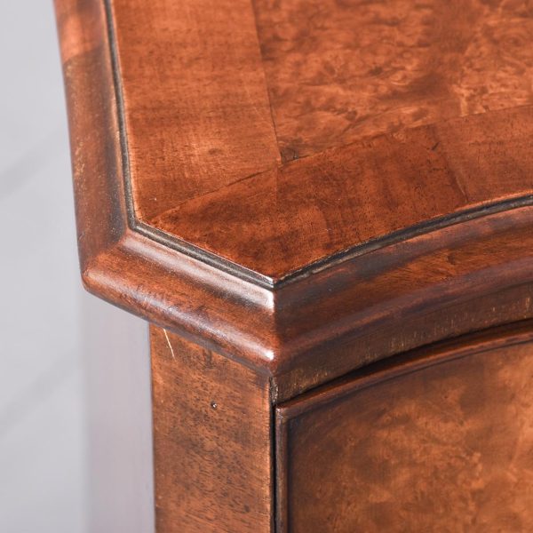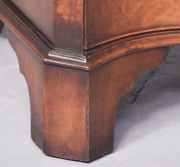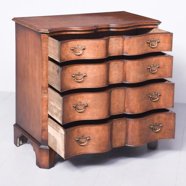 Circa 1910. Neat-size George III style burr walnut block-front chest of drawers. The crossbanded, shaped top in mirror matched fine burr walnut with moulded edges above 4 graduated block front drawers with cut brass handles flanked by canted corners. All on a neat moulded base and shaped bracket feet. In excellent condition with a lovely mellow colour and patina.