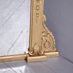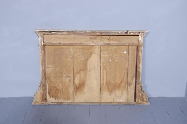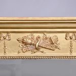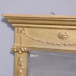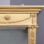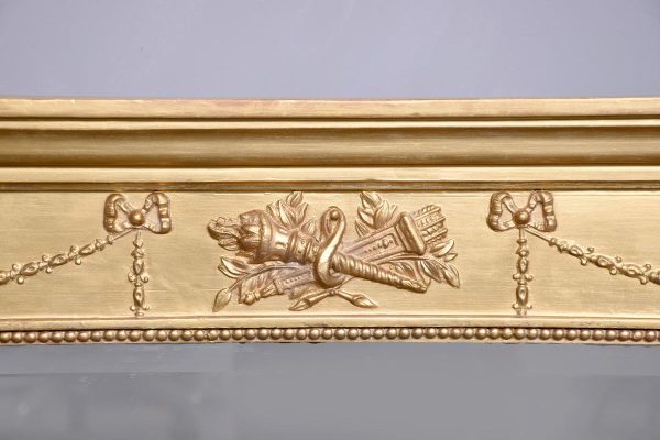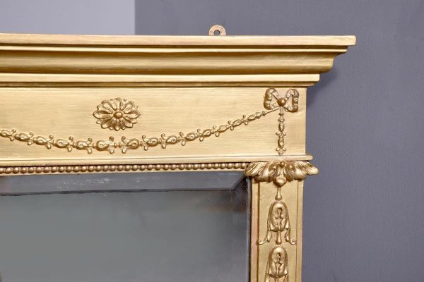 Circa 1850. Neat size Regency Gilded Overmantel Mirror with Neoclassical Decoration. surmounted by a moulded cornice, the frieze with bell flower chains, paterae, and neoclassical torch decorations. The bevel-edged mirror is in excellent condition and flanked by pillars with bellflower chains. The breakfront base with acanthus and scrolled decoration. Traditionally restored by hand and in excellent condition.
