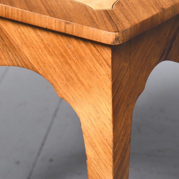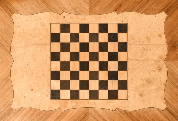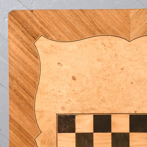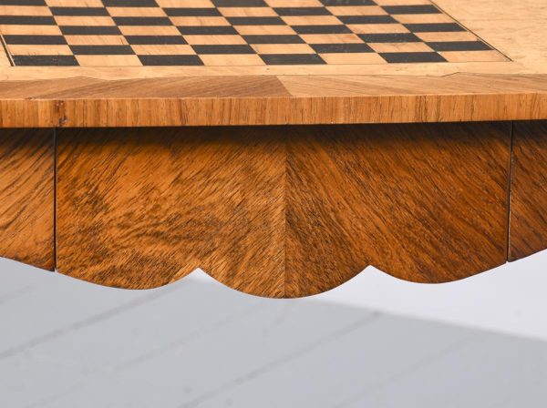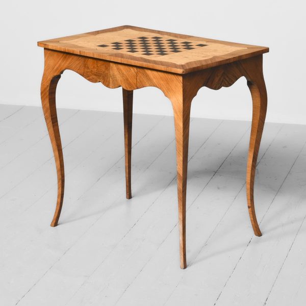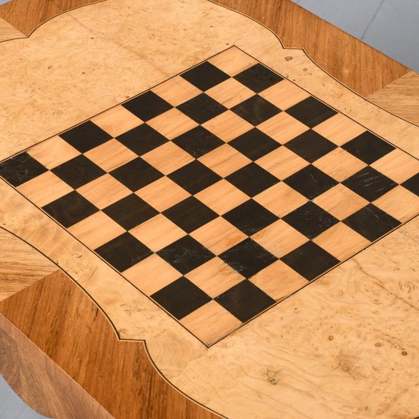 Circa. 1950. Neat size French kingwood and Birdseye maple games table. The rectangular top with kingwood banding, boxwood and ebony stringing and birdseye maple enclosing the central chest board. With a shaped apron and single drawer in front supported on angular tapering cabriole legs.