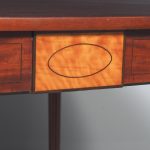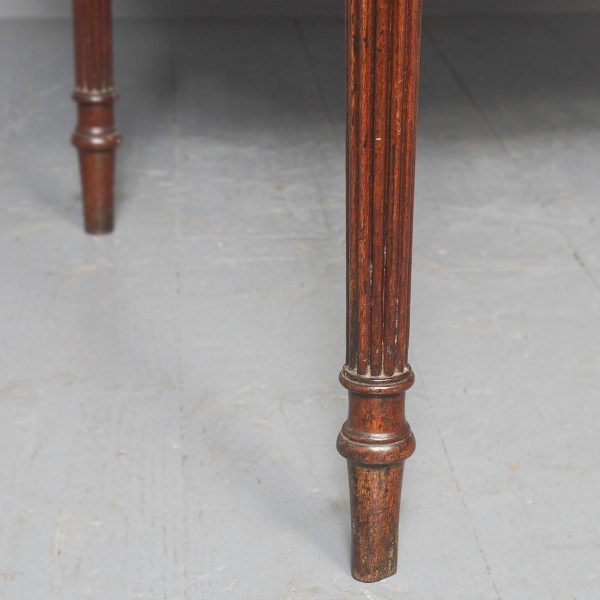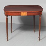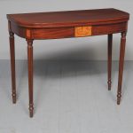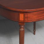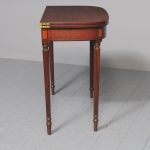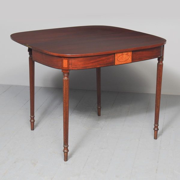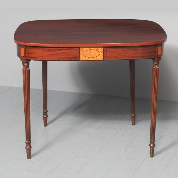 Circa 1800. A neat size late George III mahogany and inlaid fold over tea table. The D shaped top, which opens to a mirror matched interior, has a deep shaped apron with a satinwood plaque in the centre, ebony string inlay, and further inlay on the side panels. The back legs are hinged and swing out to support the table when it’s open. There’s a small inlaid panel on the top of each of the legs, the whole piece stands on 4 elegant Gillows style, turned, fluted and tapering legs which finish on an elegant toe.