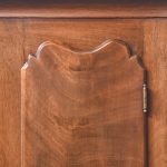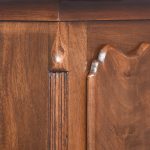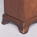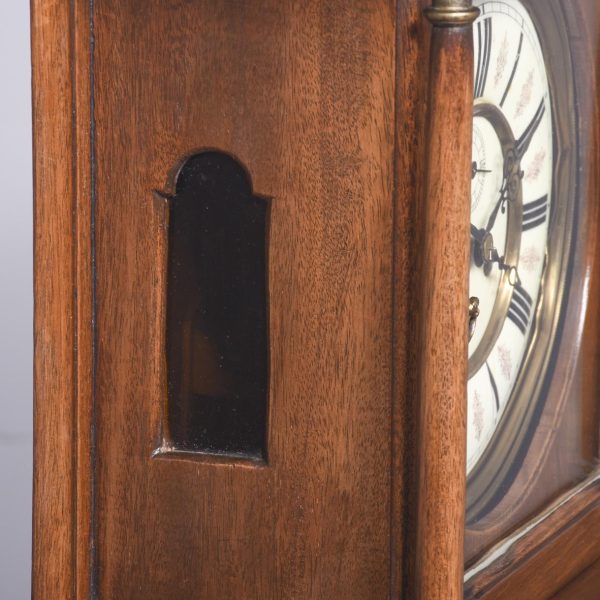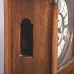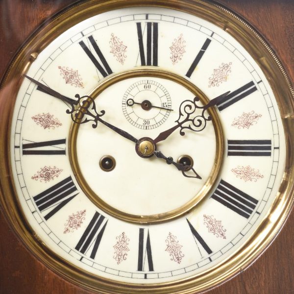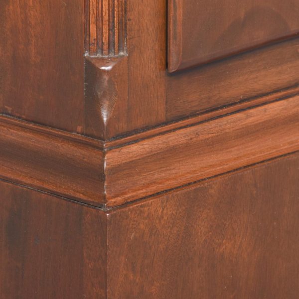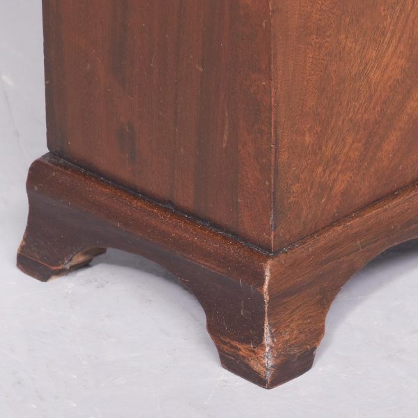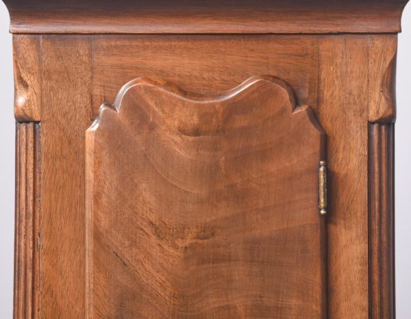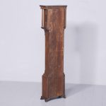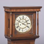 Circa 1910.  Neat-sized mahogany grandmother clock in the Georgian style. With a polished top above the glazed door opening to the circular dial with a cream background and Roman numerals.  The case with fluted chamfered corners and a shaped door above the moulded base and splayed bracket feet. Made in Edwardian times with a Victorian clock movement.  In excellent working order.