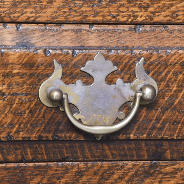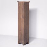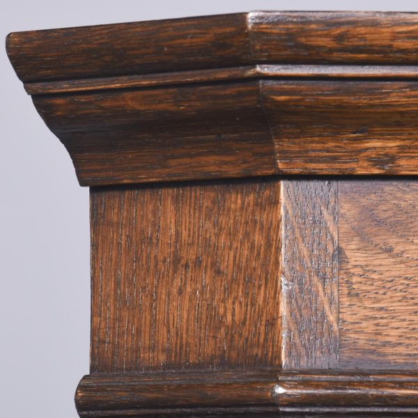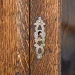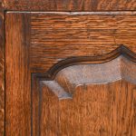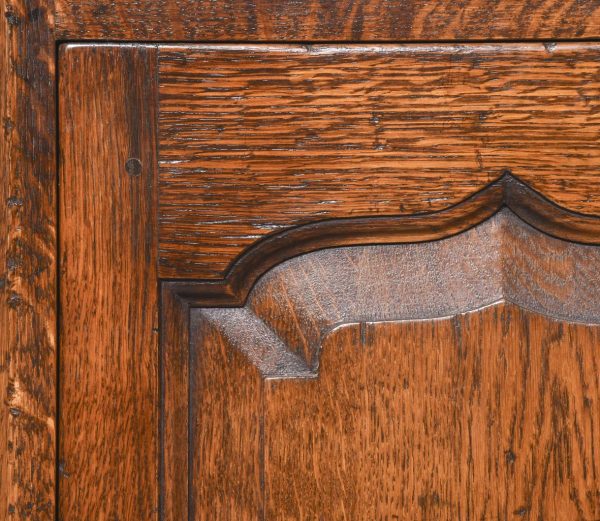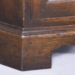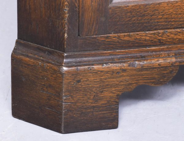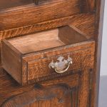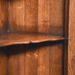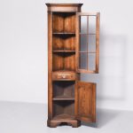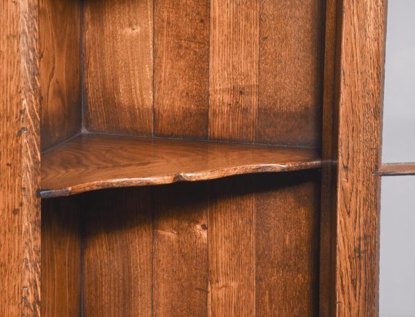 Circa 1980. A neat sized tall solid oak double corner cupboard, with a moulded cornice and simple frieze over a full-length door with six glazed panels with oak astragals, the inside is polished with two shaped shelves. Beneath the door there is a drawer with stylish cast brass handle, the base with panel door which has a slight arch, the bottom with further mouldings resting on stylish bracket feet.