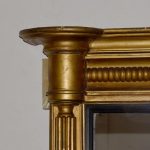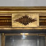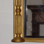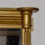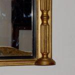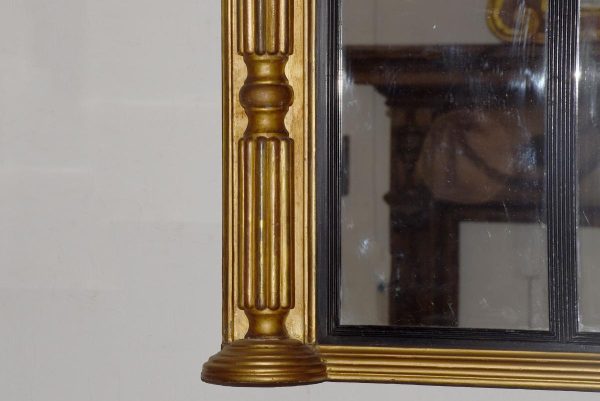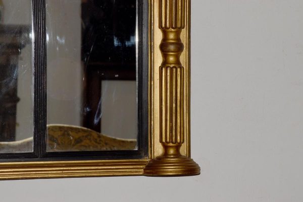 Circa 1830. Regency giltwood triptych overmantel mirror. Surmounted by a moulded cornice with outswept rounded corners above a roundel decorated frieze with a central plaque with open foliate decoration. The three mirror sections with ebonized fluted slips flanked by fluted pilasters over a fluted base with rounded corners.
