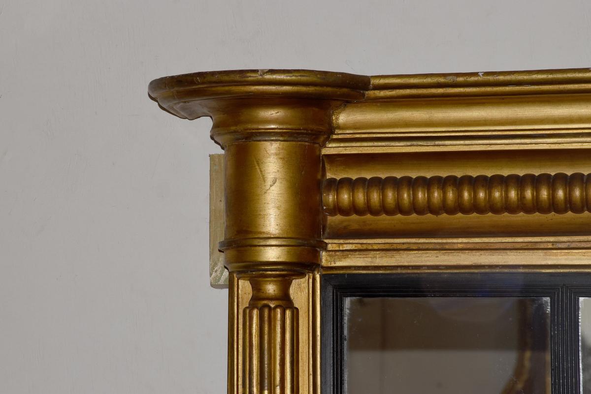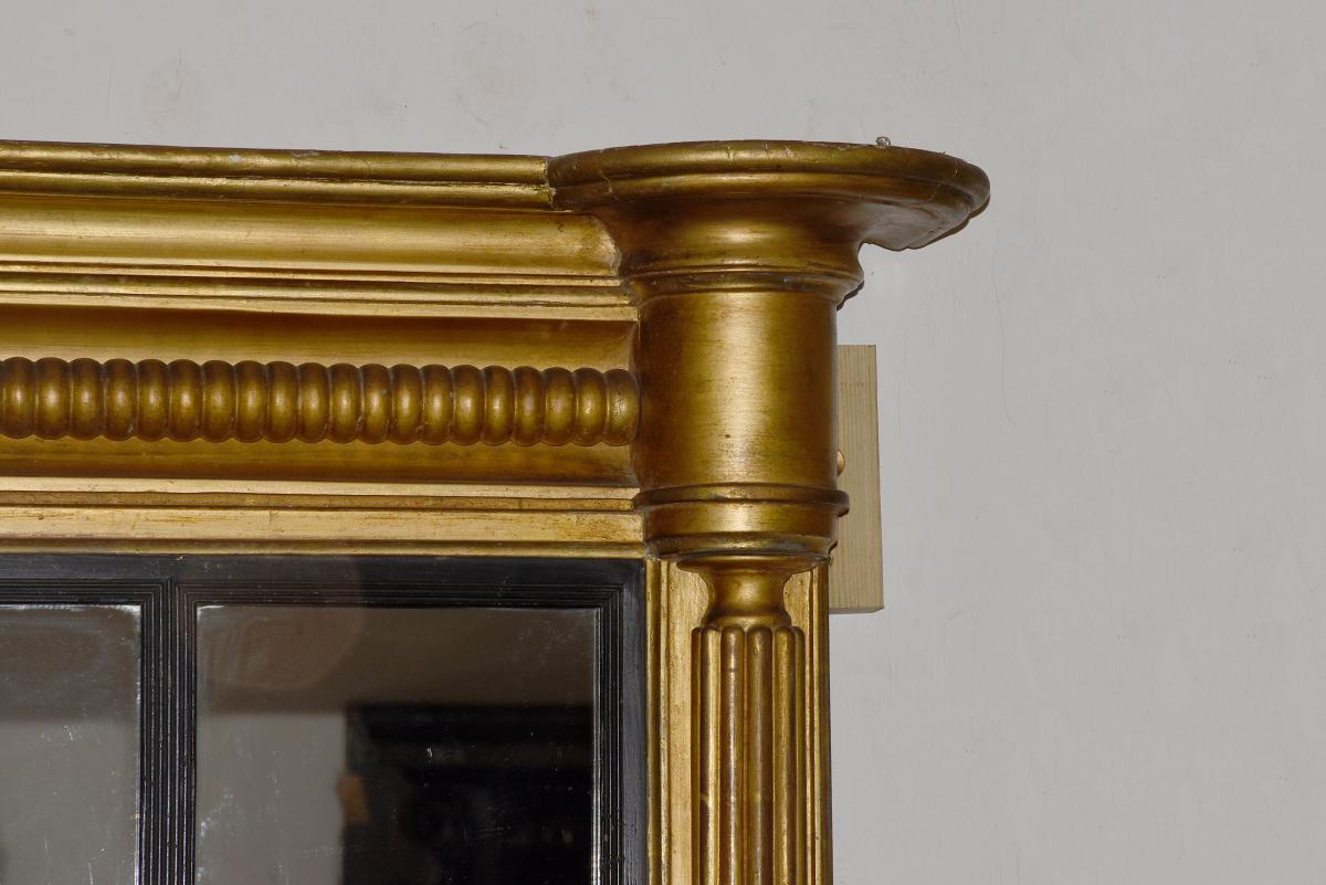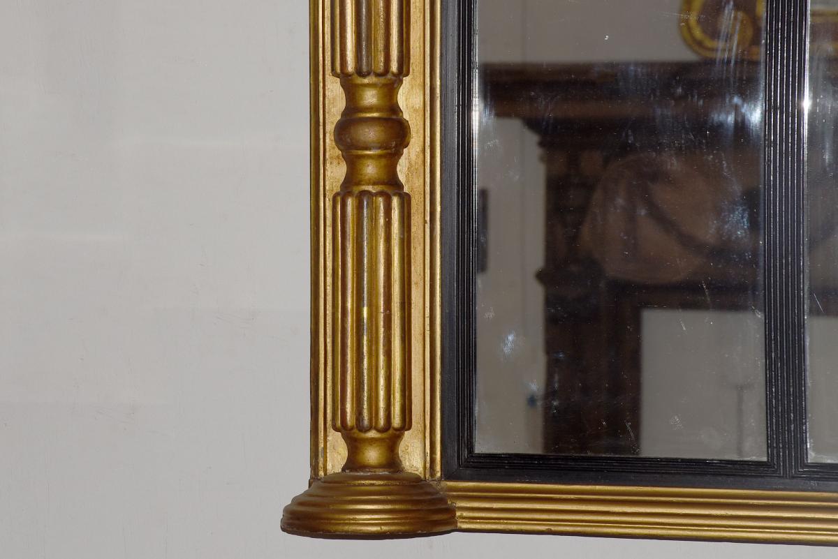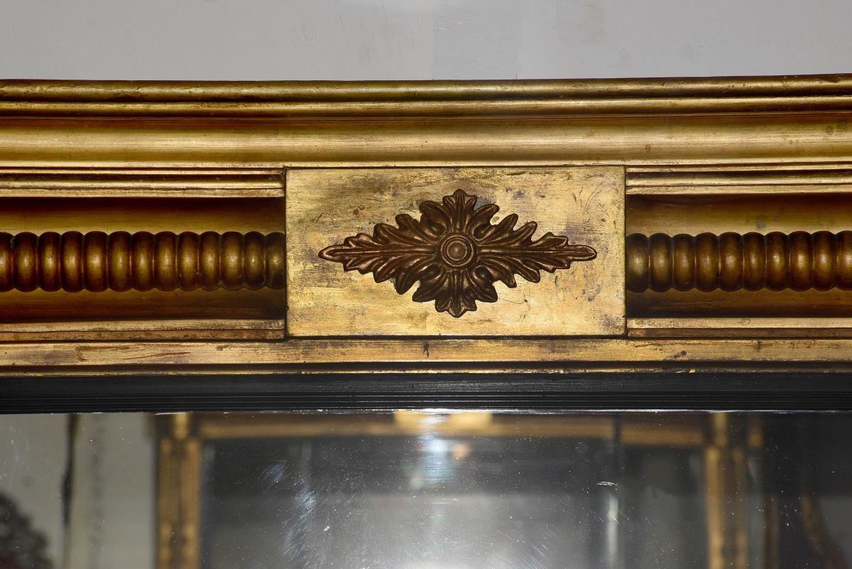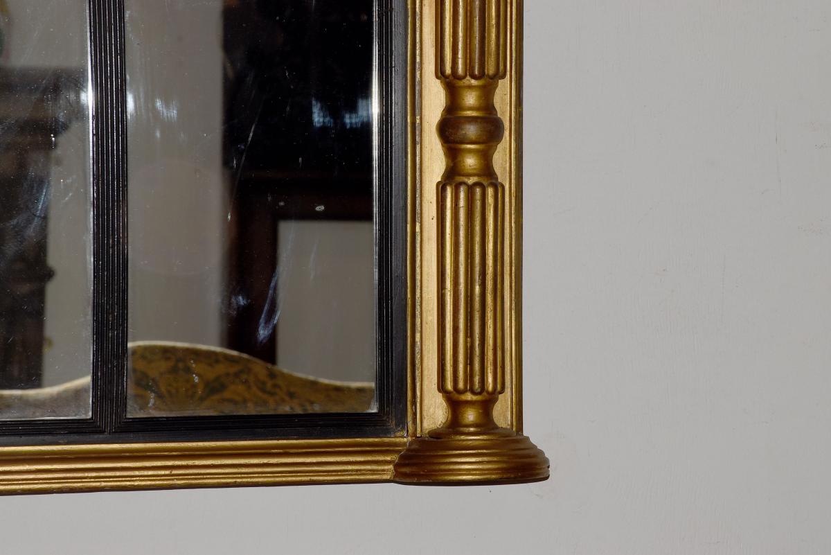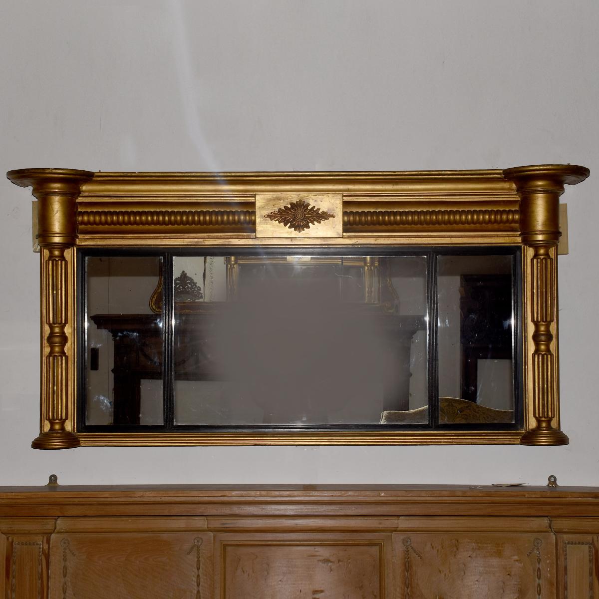 Circa 1830. Regency giltwood triptych overmantel mirror. Surmounted by a moulded cornice with outswept rounded corners above a roundel decorated frieze with a central plaque with open foliate decoration. The three mirror sections with ebonized fluted slips flanked by fluted pilasters over a fluted base with rounded corners.