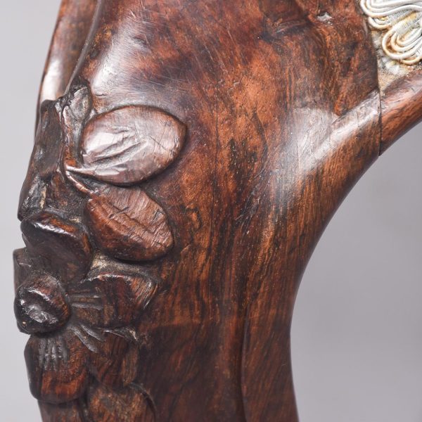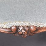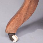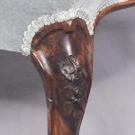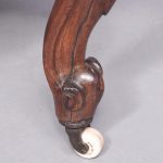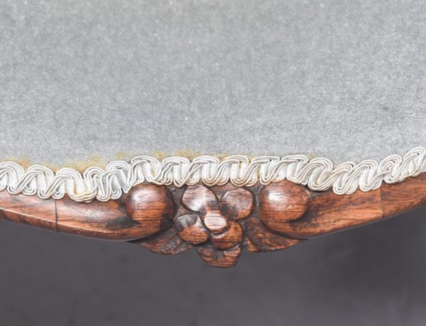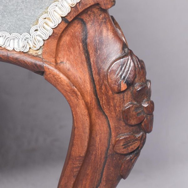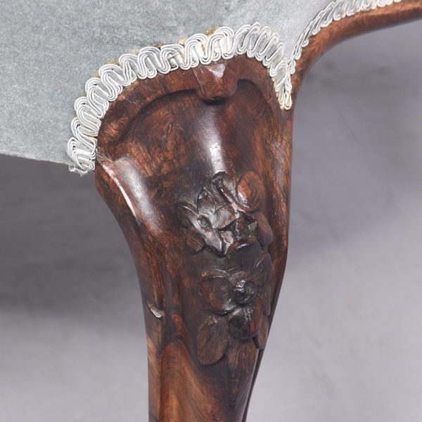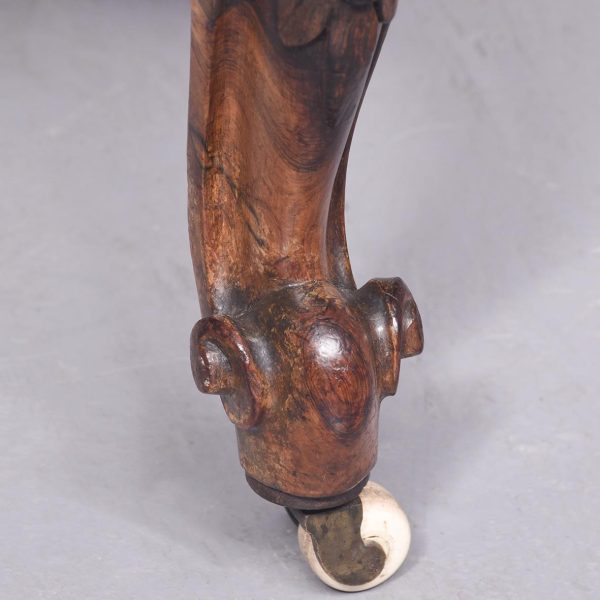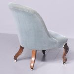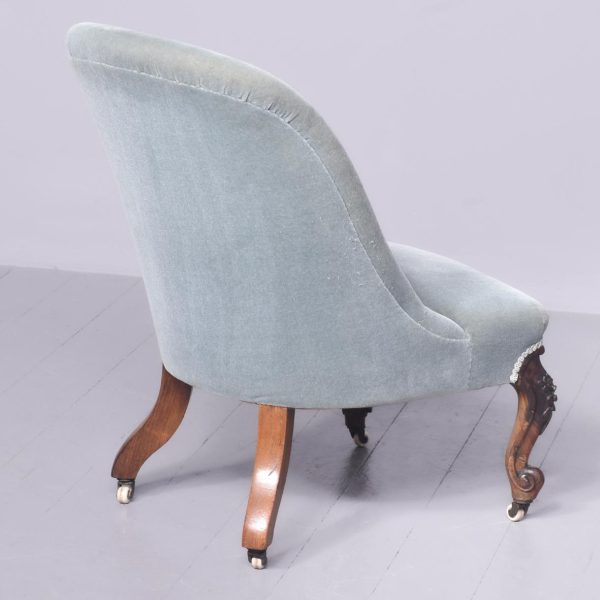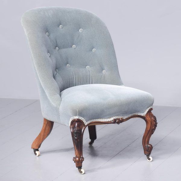 Circa 1860. Neat-sized Victorian, mahogany-framed cabriole leg lady’s chair. The spoon back with deep buttoning above the serpentine overstuffed seat, all upholstered in a blue-grey velvet in excellent condition. With foliate carving to the seat rail and supported on front carved cabriole legs with scrolled toes and original brass and white porcelain castors and out swept rear supports.