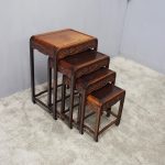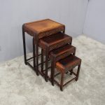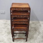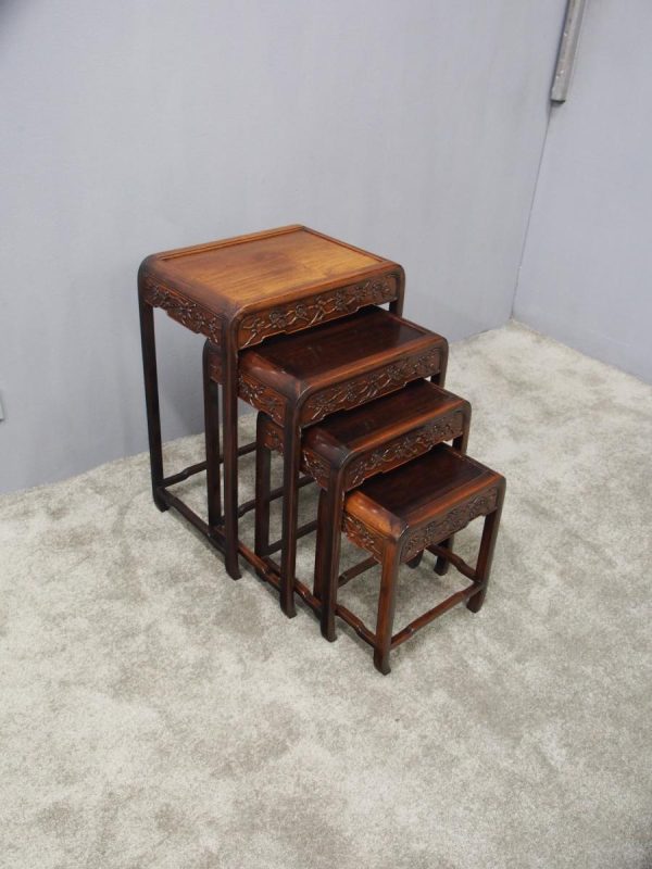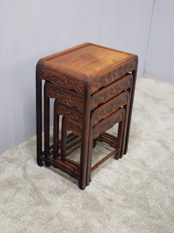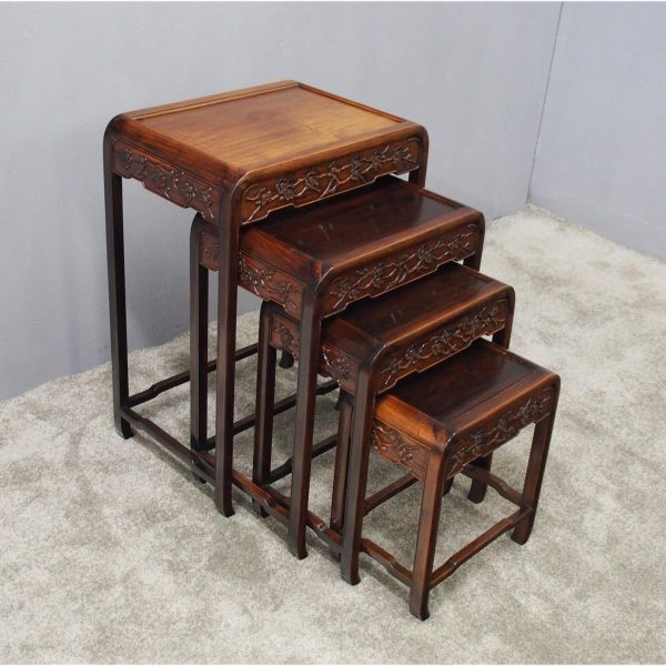 Circa 1900, nest of 4 Chinese hongmu tables. With top framed with beading, curved fore-edge and a carved cherry blossom frieze. Standing on a classic Chinese foot and given further stability from stretchers.