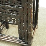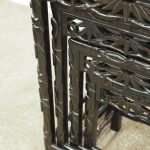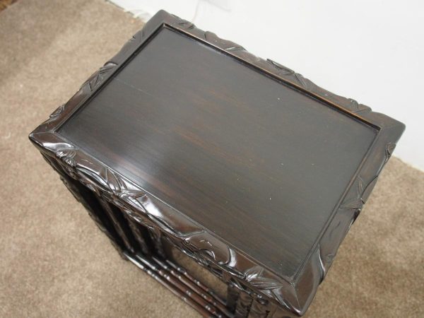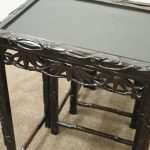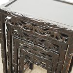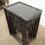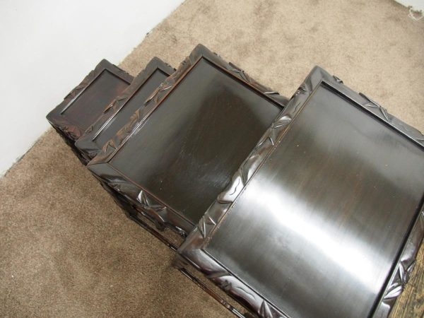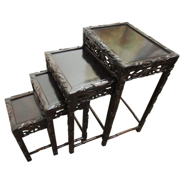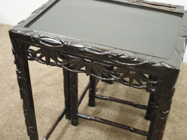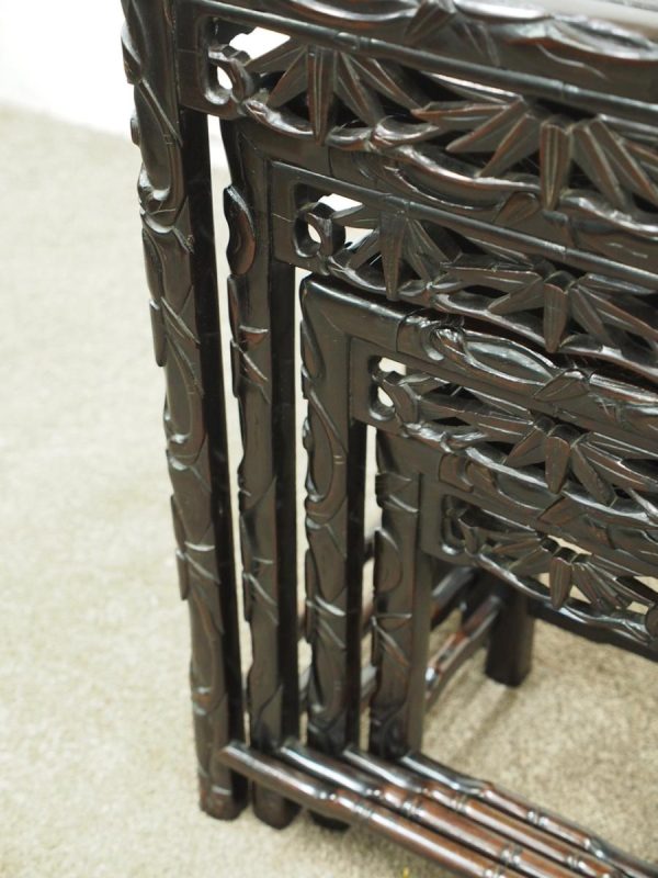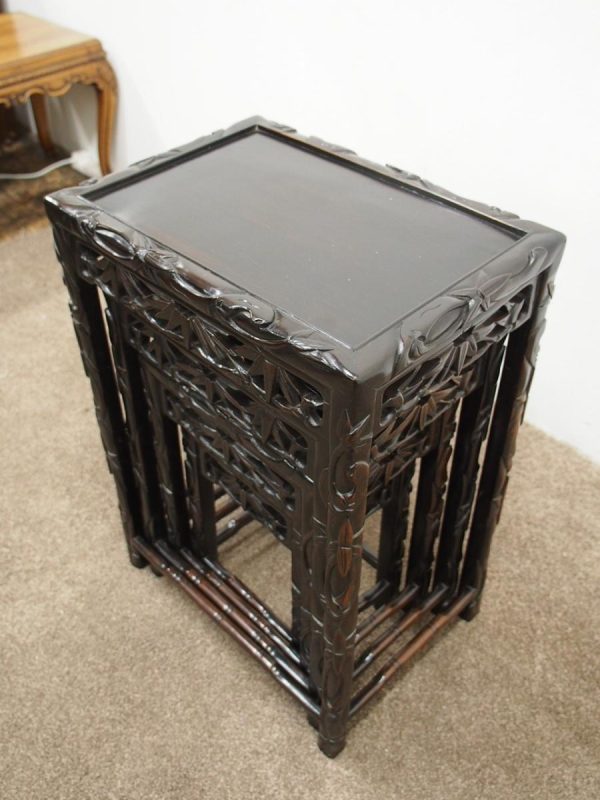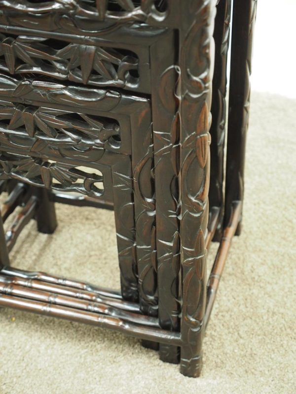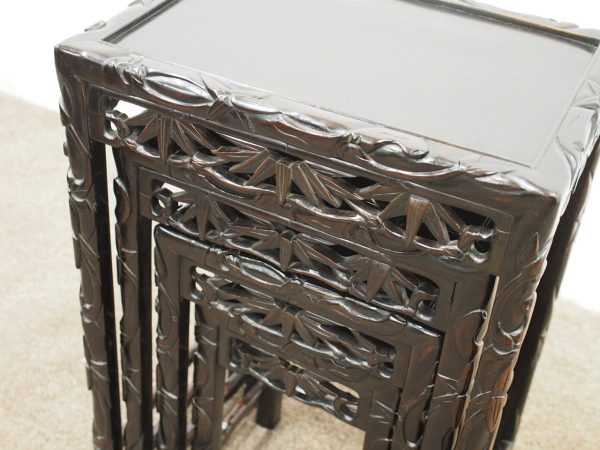 Circa 1890, nest of four Chinese rosewood tables. The inset panelled tops are surrounded by a carved faux bamboo decorated frame. Each has an open, foliate carved frieze and rectangular faux bamboo decorated legs with shaped supports.
