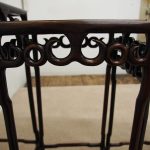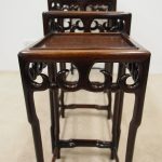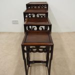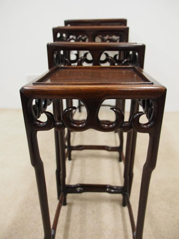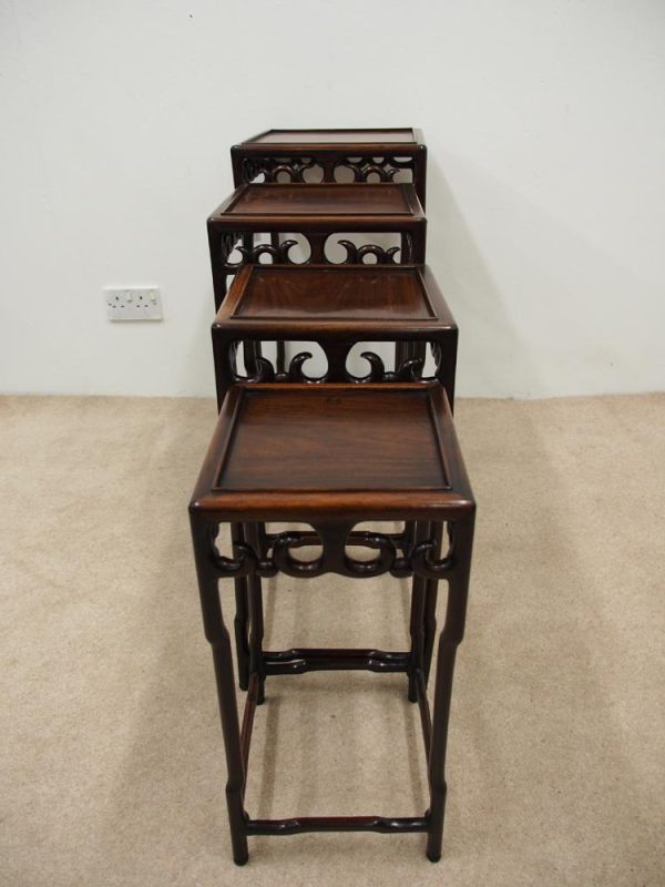 Circa 1890, fine quality nest of 4 Chinese tables. The tables are possibly made of hongmu, with a pierced carved frieze of classical Chinese form. This unusual set of tables stack together rather than sliding in underneath one another. All the tables are solid and have beautiful colour and patina.