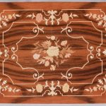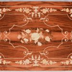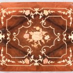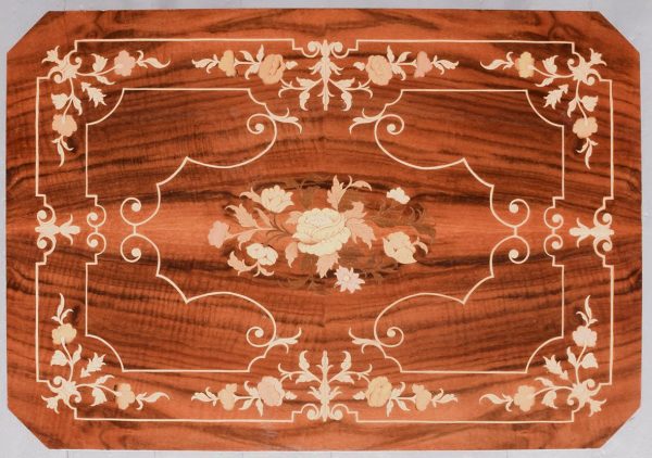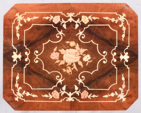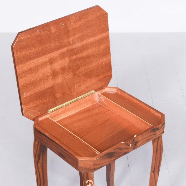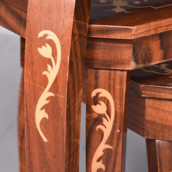 Circa 1950’s. A nest of three inlaid walnut tables from, Sorrento in Italy, with typical Italian inlay including floral marquetry framed with scrolling boxwood inlay, all with canted corners the tables nestle into together neatly. The smallest table has a hinged top and when opened plays; Greensleeves’. All the tables rest on four simple cabriole legs with foliate inlay on the top.