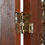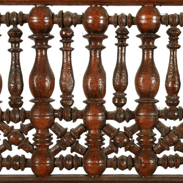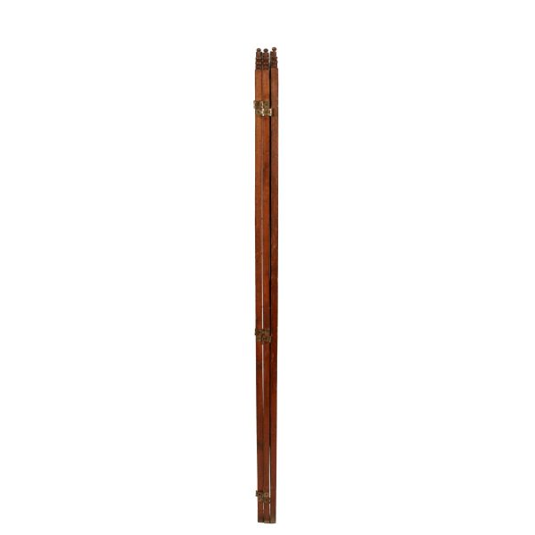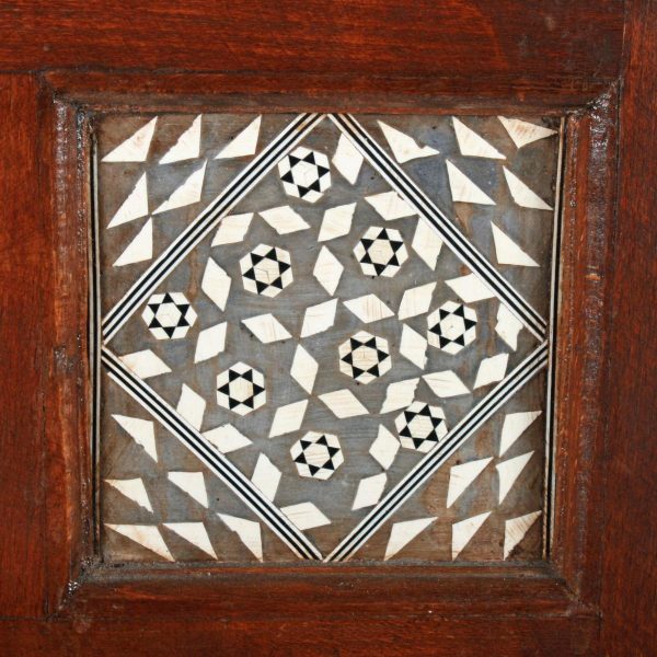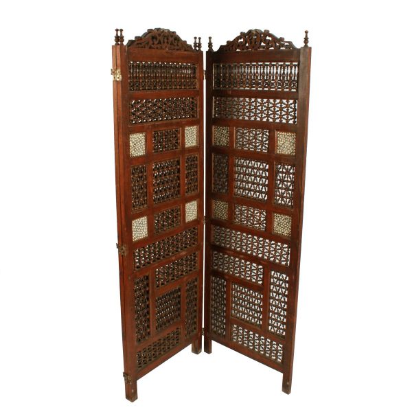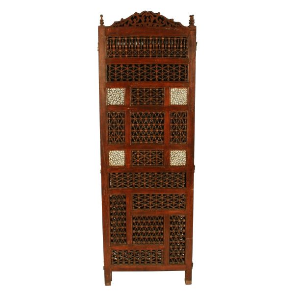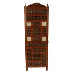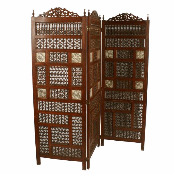 Circa 1900, A North African three-fold screen, probably made for Liberty’s of London. The top with decorative scrolling fretwork and turned finials, the three folding panels are smothered in mashrabiya woodwork with classic designs, including small bone inlaid panels. This heavy, well made screen has two-fold hinges making it very adaptable.