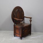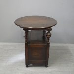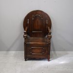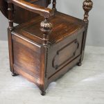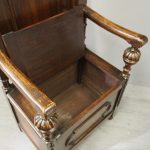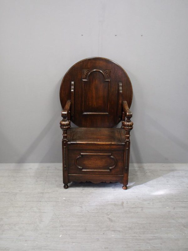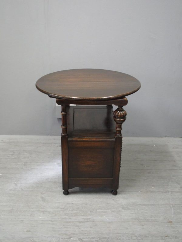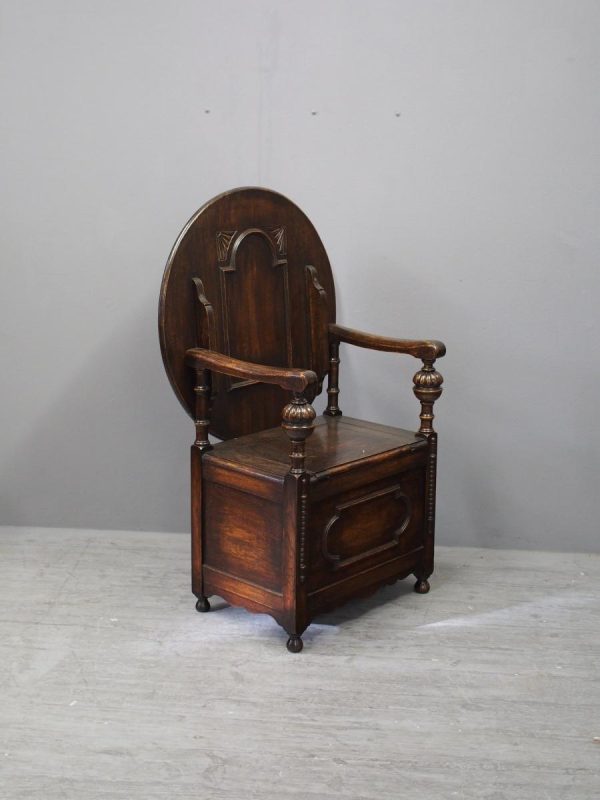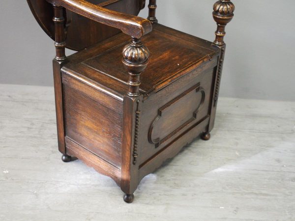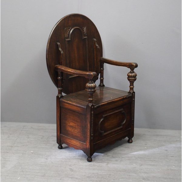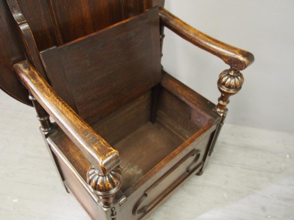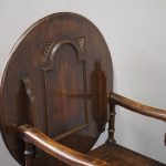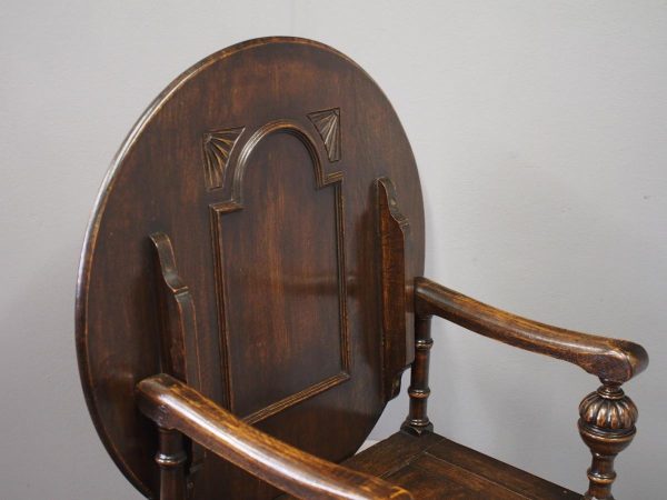 Circa 1930, neat oak monks bench or hall bench. With a folding circular top with gothic decorations to the underside which is over shaped arms and on fluted and turned supports. It has a lift up seat with storage beneath and a panelled front, finishing on neat bun feet.