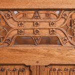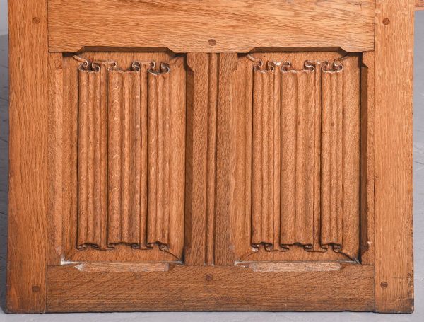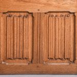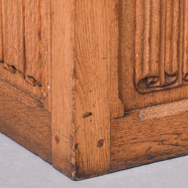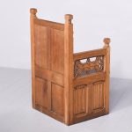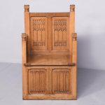 Circa 1880 a carved oak gothic revival hall seat, the paneled back with gothic tracery supported by sturdy uprights with large finials, the simple arms with a pierced sides including pierced carving, the large solid hinged seat opens to reveal an uninterrupted interior, the front and sides with carved linen folds with the peg joints clearly visible, all resting on an enclosed base.