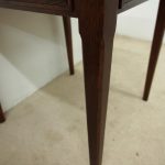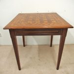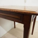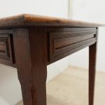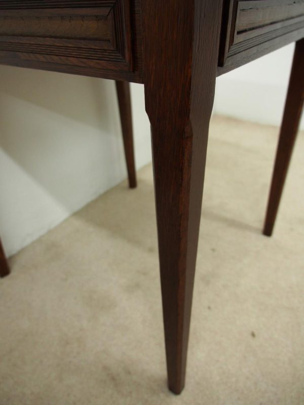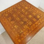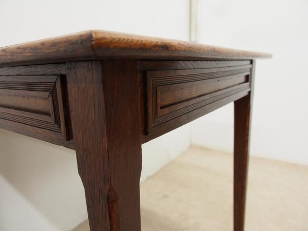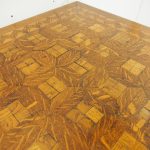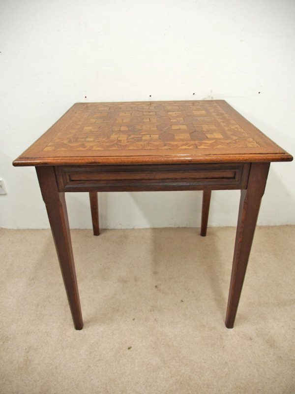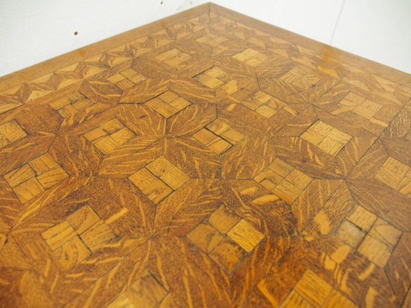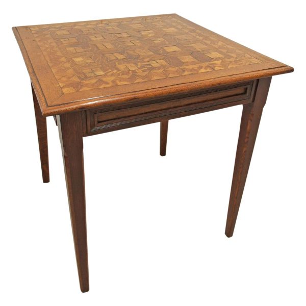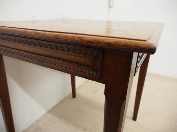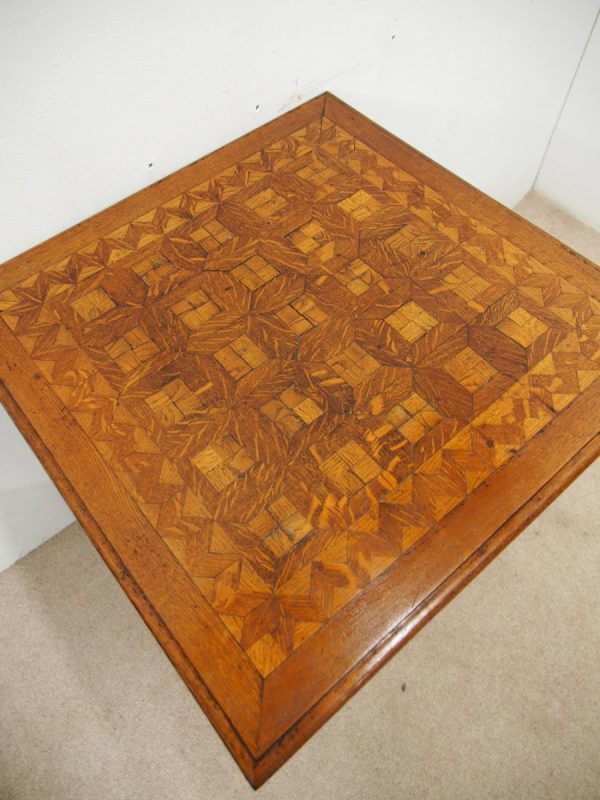 Circa 1900, unusual oak occasional table. With a cross banded top and central parquetry panels, creating geometric patterns across with small solid oak blocks. The top has a moulded edge and there are fielded panels to the apron, all standing on square, chamfered tapering legs.
