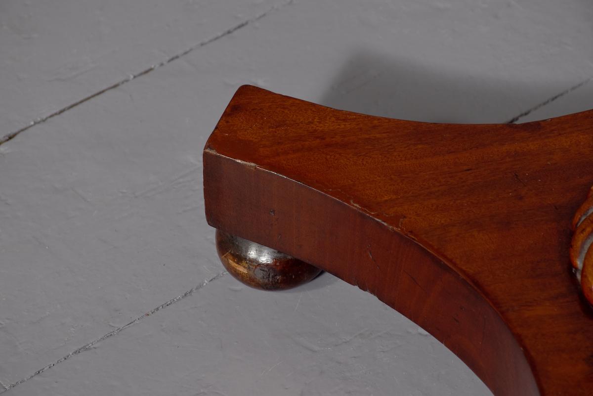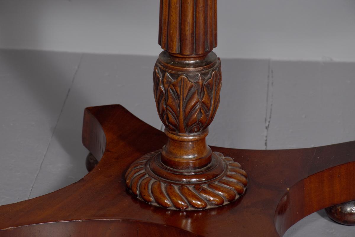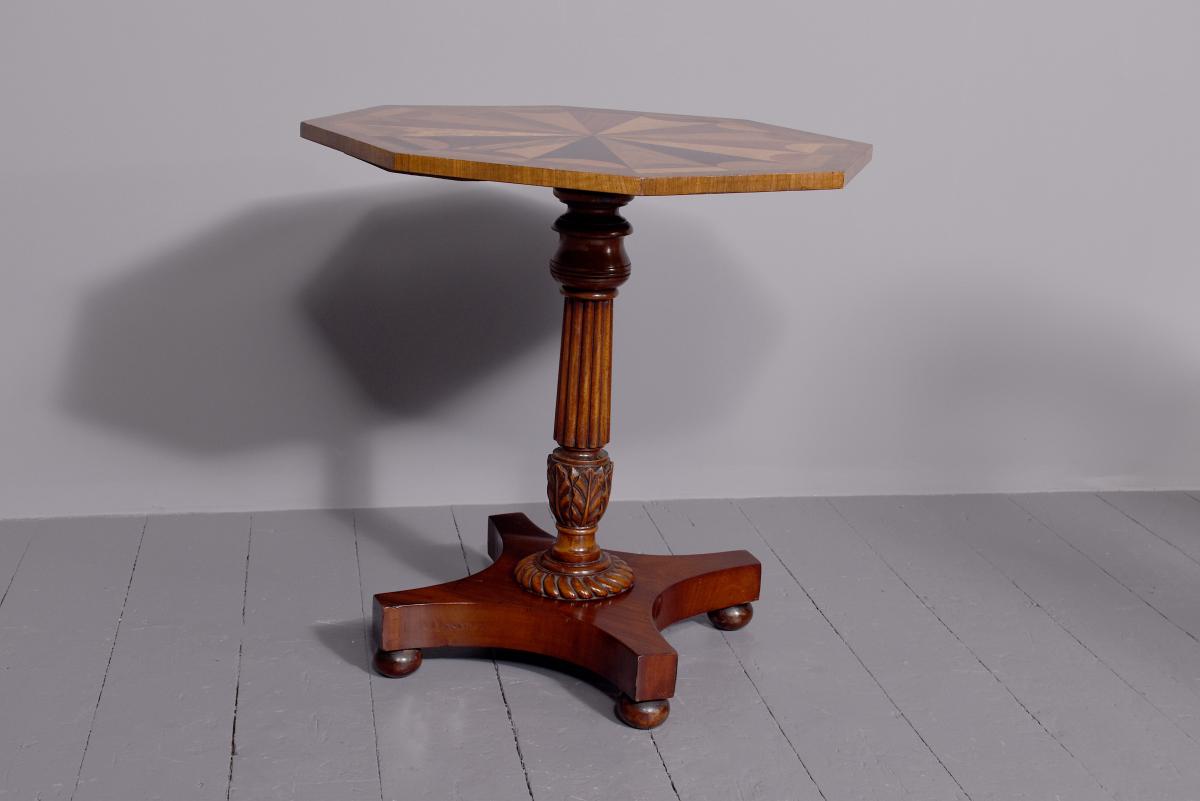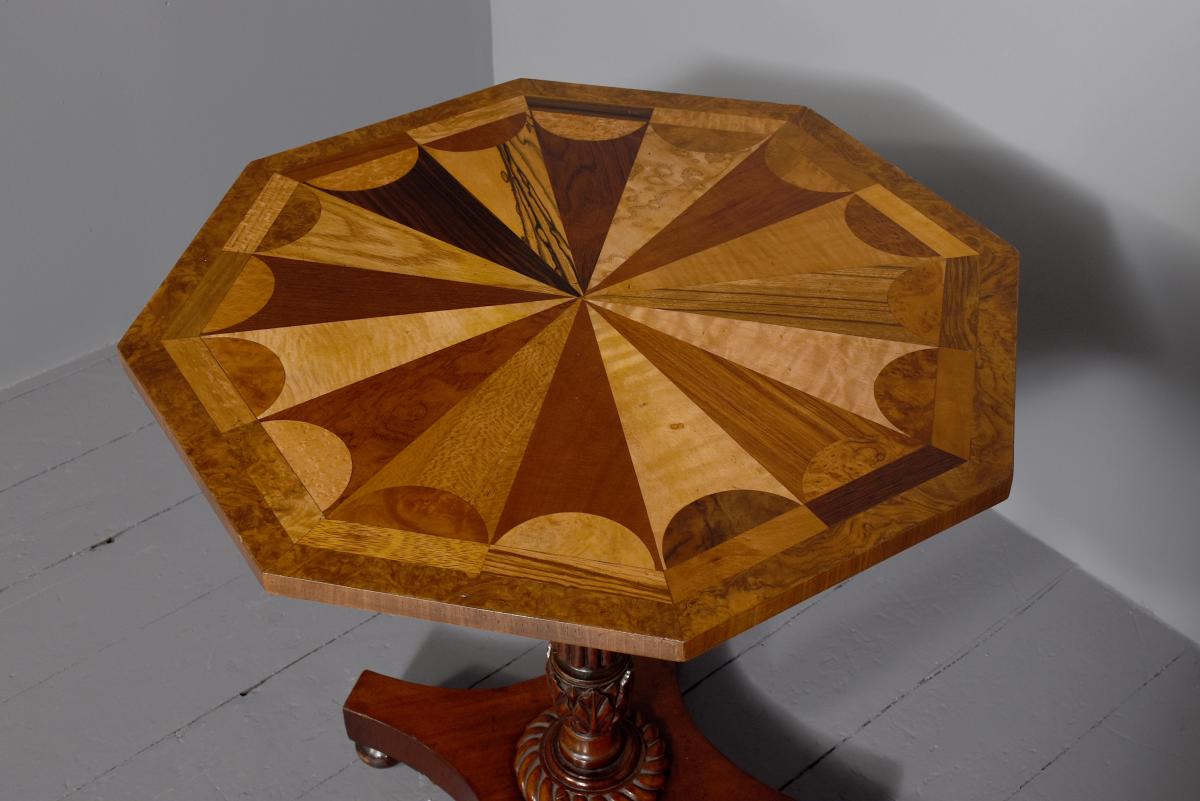 Circa 1820. An unusual and stylish octagonal shaped occasional table, the top with multiple woods including ash, kingwood, walnut and satinwood formed in a sunburst fashion with small lunettes and broad crossbedding in other woods, finishing with burr walnut, supported on a classic turned, ring turned, fluted and carved stem with foliate carving towards the base, with a dragooned collar, resting on a concave quadruple platform base, with four squat bun feet below.