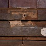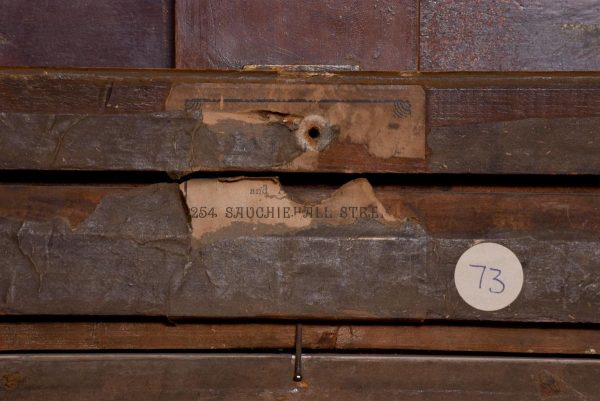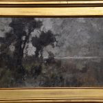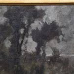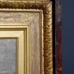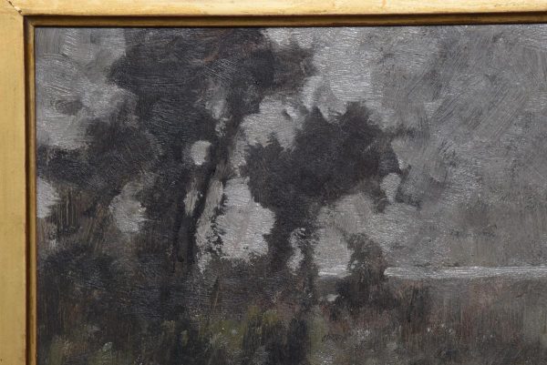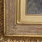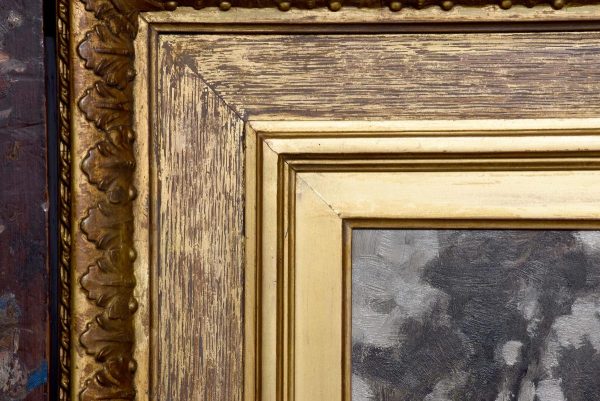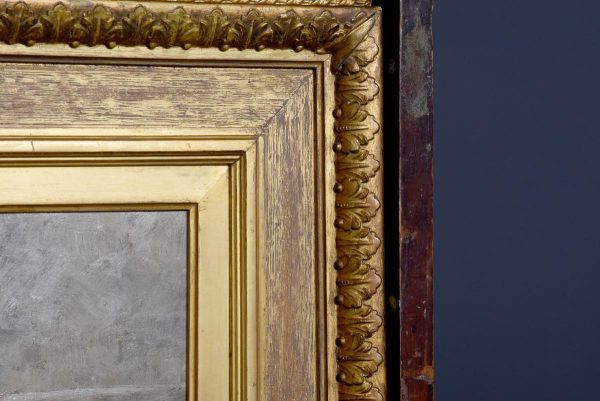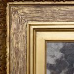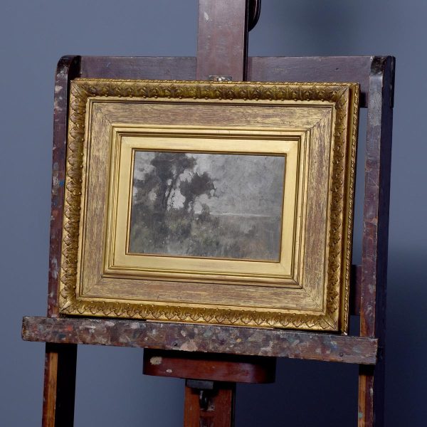 Circa 1900. An interesting oil on canvas depicting of rural scene with trees with cloud background, foliage in the front, signed on the bottom ‘A.K.B’, the painting is contained in a stylish moulded gilt slip with a gilded oak middle section with foliate carving on a raised lip, with an egg and dart section behind. The back of the painting has the remnants of a dealer or gallery at 254 Sauchiehall Street, Glasgow. The frame, gilding and painting are in excellent condition.