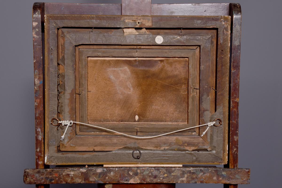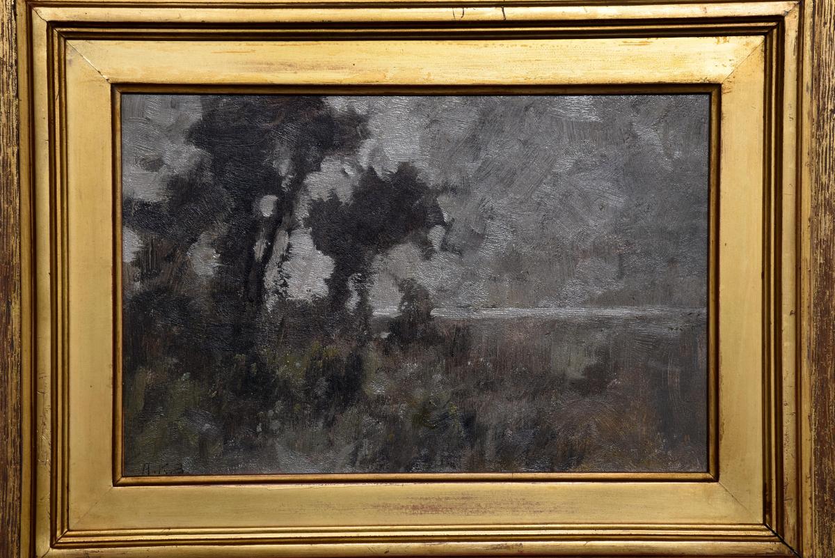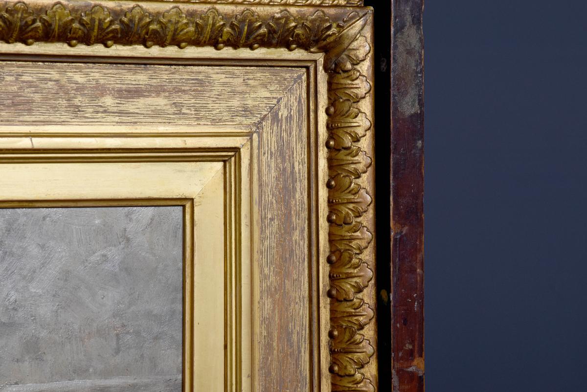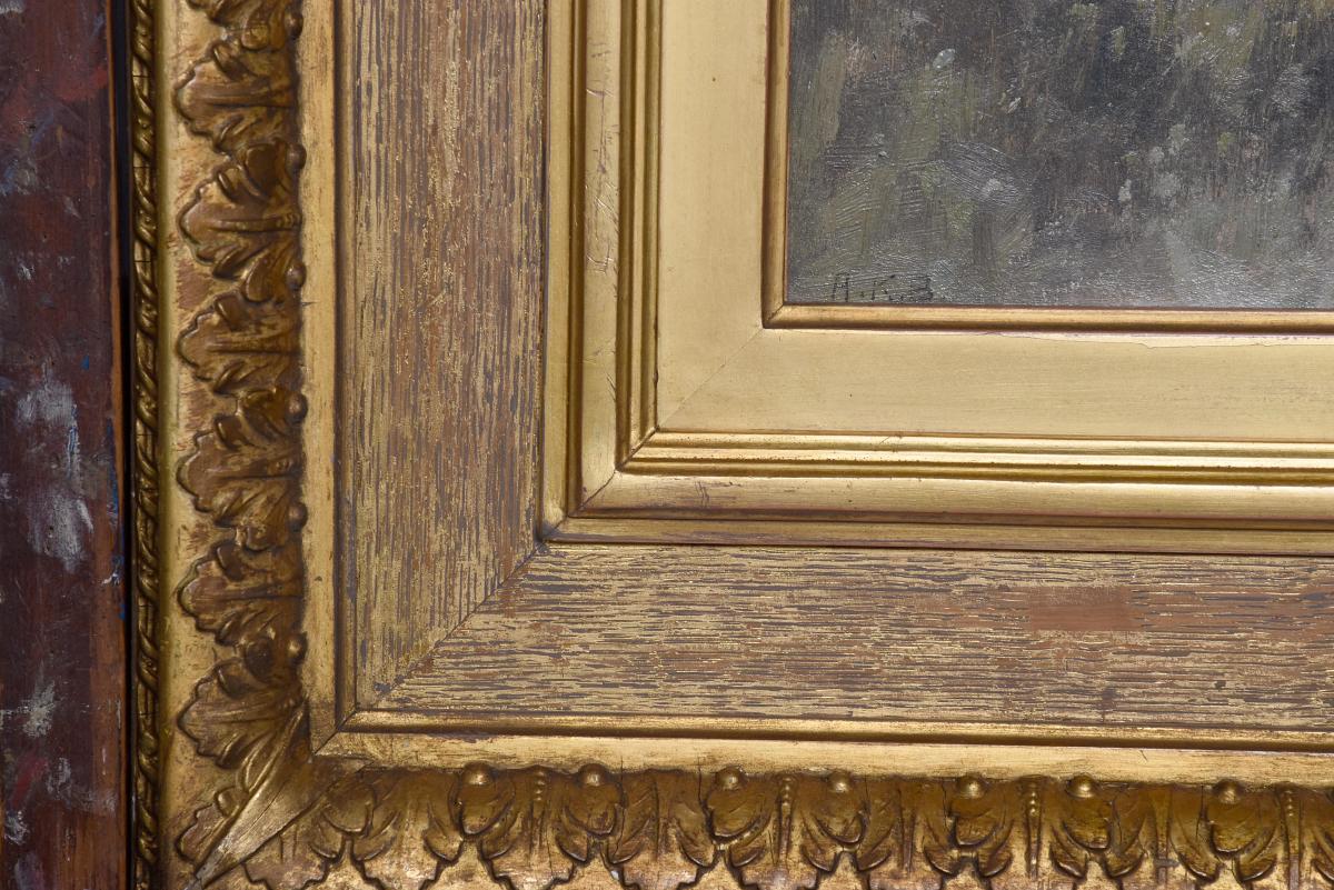 Circa 1900. An interesting oil on canvas depicting of rural scene with trees with cloud background, foliage in the front, signed on the bottom ‘A.K.B’, the painting is contained in a stylish moulded gilt slip with a gilded oak middle section with foliate carving on a raised lip, with an egg and dart section behind. The back of the painting has the remnants of a dealer or gallery at 254 Sauchiehall Street, Glasgow. The frame, gilding and painting are in excellent condition.