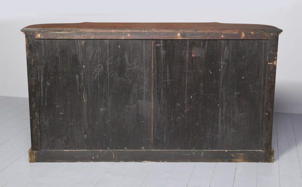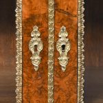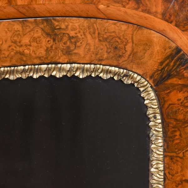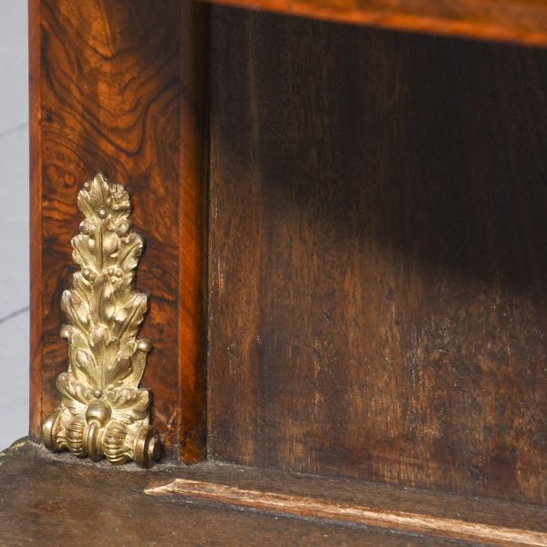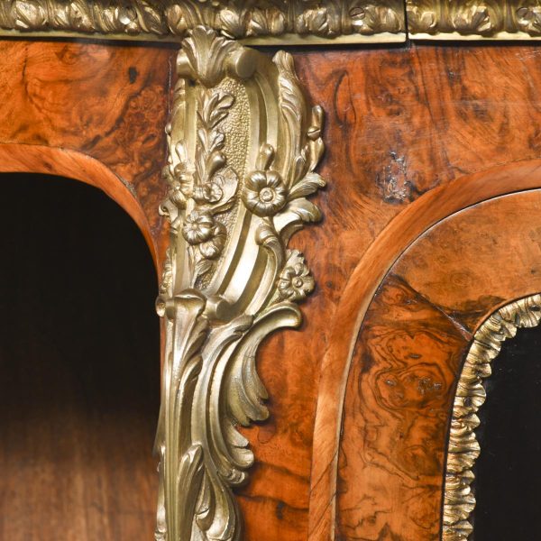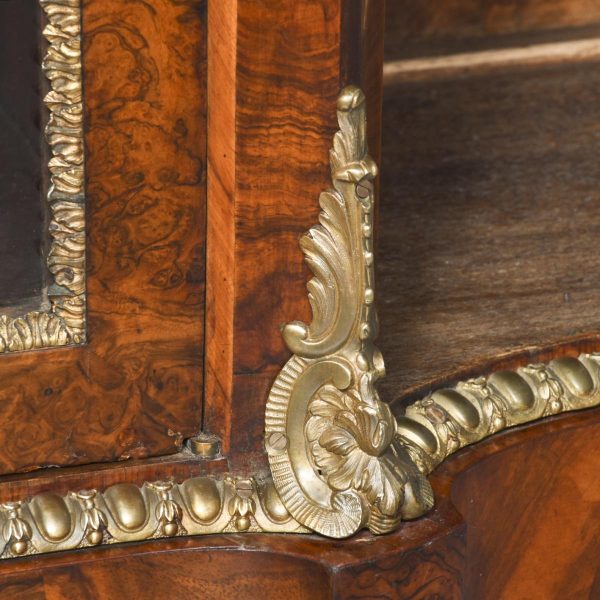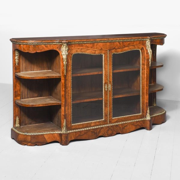 Circa 1870. An open-ended figured walnut Victorian credenza. The shaped top in a nicely figured walnut with moulded fore-edges with foliate brass mounts. The shaped frieze above two shaped glazed doors with all ormolu mounts opening to a shelved interior. The bow-end sides with three open shelves and ornate brass mounts. All supported on an enclosed shaped plinth base with fine mounts. All in perfect condition with a lovely colour and patina.